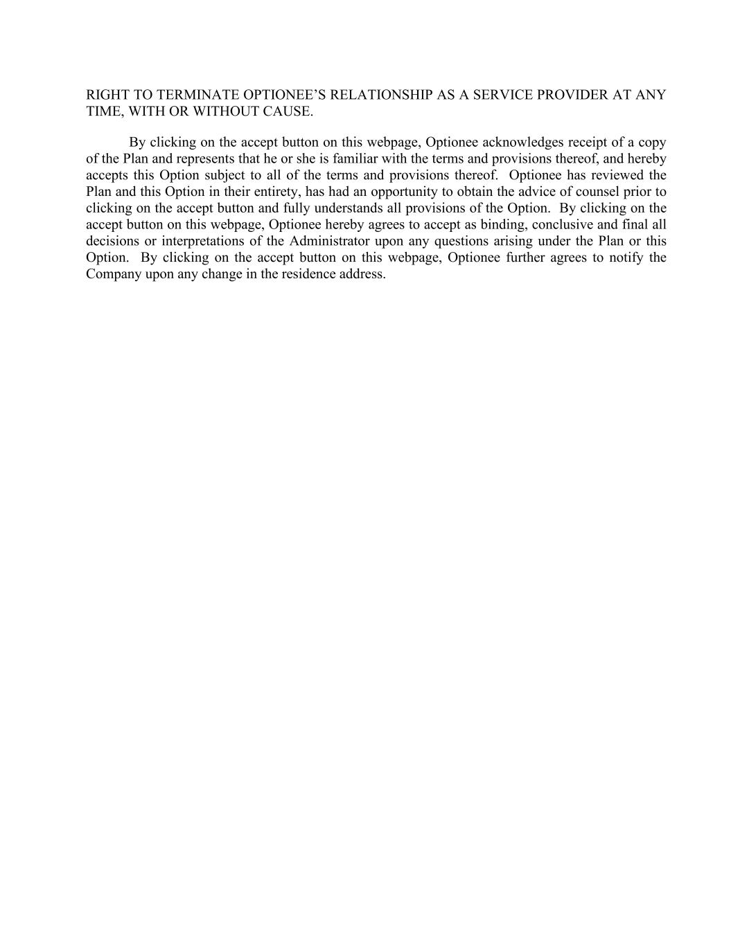 RIGHT TO TERMINATE OPTIONEE’S RELATIONSHIP AS A SERVICE PROVIDER AT ANY TIME, WITH OR WITHOUT CAUSE. By clicking on the accept button on this webpage, Optionee acknowledges receipt of a copy of the Plan and represents that he or she is familiar with the terms and provisions thereof, and hereby accepts this Option subject to all of the terms and provisions thereof. Optionee has reviewed the Plan and this Option in their entirety, has had an opportunity to obtain the advice of counsel prior to clicking on the accept button and fully understands all provisions of the Option. By clicking on the accept button on this webpage, Optionee hereby agrees to accept as binding, conclusive and final all decisions or interpretations of the Administrator upon any questions arising under the Plan or this Option. By clicking on the accept button on this webpage, Optionee further agrees to notify the Company upon any change in the residence address.