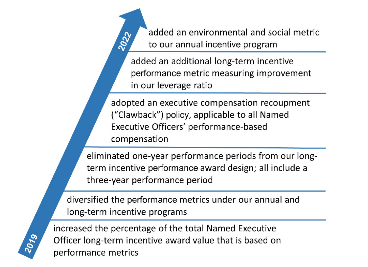 | ✓ | Three-year performance periods for long-term incentive awards |