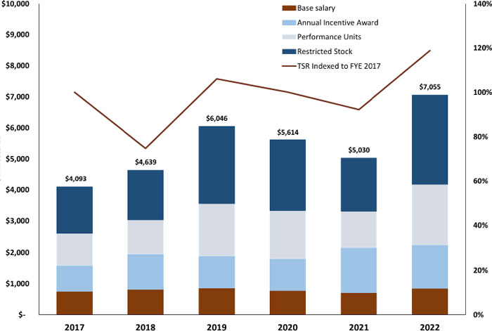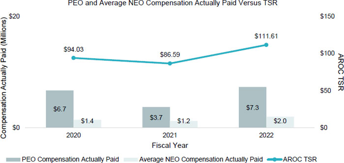 As demonstrated by the following chart, the amount of Compensation Actually Paid to our PEO and the average of Compensation Actually Paid to our other NEOs is aligned with the Company’s cumulative TSR over the three years presented in the chart. The alignment of Compensation Actually Paid with the Company’s TSR over the period is because a significant portion of the Compensation Actually Paid to our PEO and other NEOs is comprised of equity awards. As described in more detail in the section “Executive Compensation – Compensation Discussion and Analysis”, for the 2022 year for example, approximately 70% and 55% of the value of total compensation awarded to our PEO and other NEOs, respectively, was comprised of equity awards, including restricted stock awards and performance units.