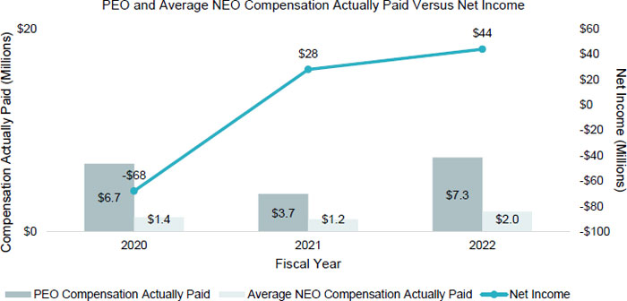 The following chart sets forth the relationship between Compensation Actually Paid to our PEO, the average of Compensation Actually Paid to our other NEOs, and our net income during the three most recently completed fiscal years. While the Company does not use net income as a performance measure in its overall executive compensation program, the measure of net income is generally correlated with the measure of Adjusted EBITDA, which the Company does use when setting goals in the Company’s annual incentive program and CAD and Leverage Performance Units. As described in more detail in the section “Executive Compensation – Compensation Discussion and Analysis”, for the 2022 year, approximately 16% and 20%, respectively, of the value of total compensation awarded to our PEO and our other NEOs, respectively, consisted of amounts under the Company’s short-term incentive program.