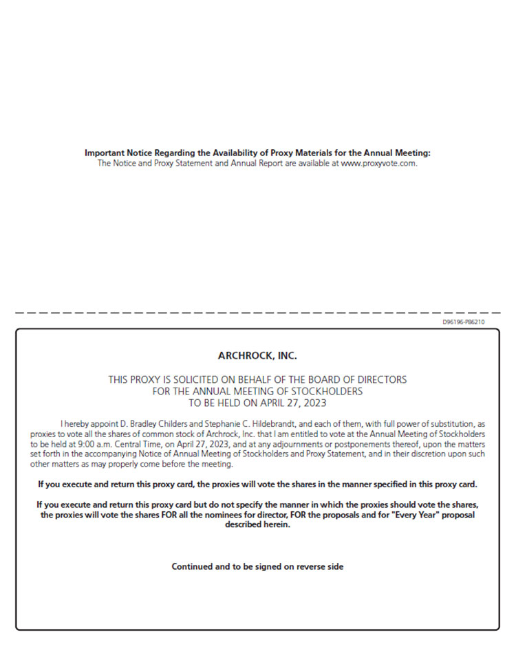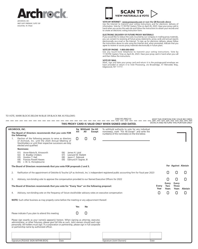 AVAILABILITY OF PROXY MATERIALS This Proxy Statement and our 2022 Annual Report to Stockholders are available at www.archrock.com. Stockholders are encouraged to access and carefully review the proxy materials before voting. We commenced mailing and made this Proxy Statement and proxy card available on the Internet on March 15, 2023. |