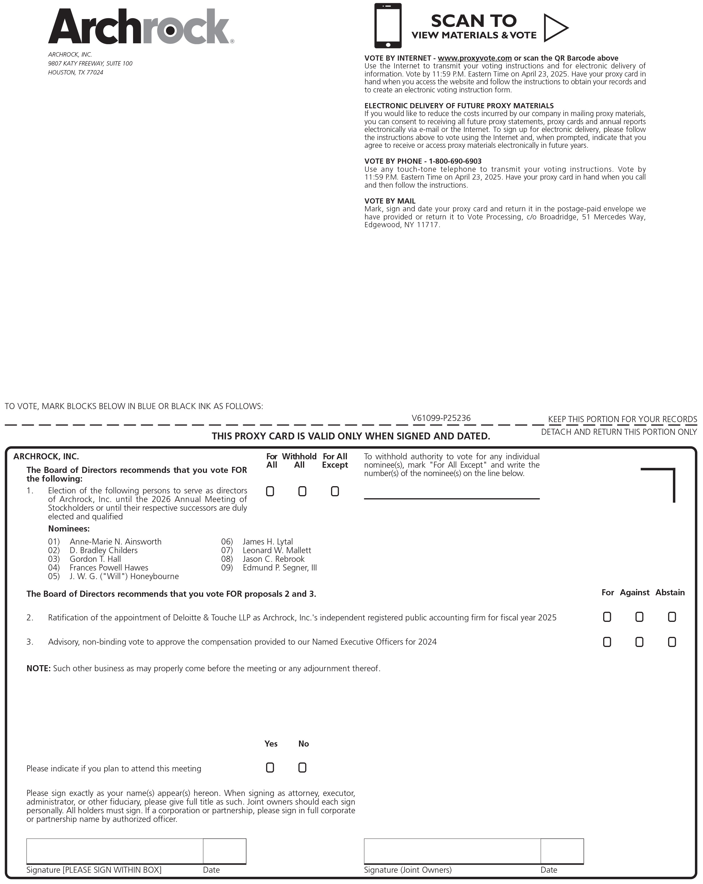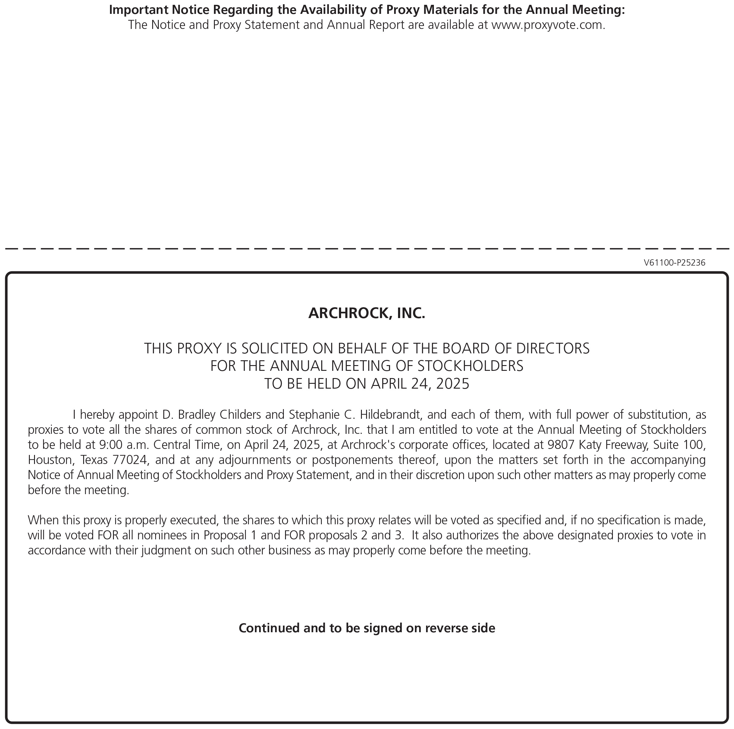 On behalf of the Board of Directors and our management team, we cordially invite you to attend Archrock, Inc.’s Annual Meeting of Stockholders, which will be held at 9:00 a.m. Central Time on Thursday, April 24, 2025, at our corporate offices located at 9807 Katy Freeway, Suite 100, Houston, Texas.