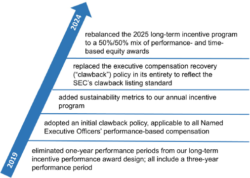 | ✓ | 33% gender and racial diversity for director nominees in 2025; half of Board leadership roles were held by women in 2024 |