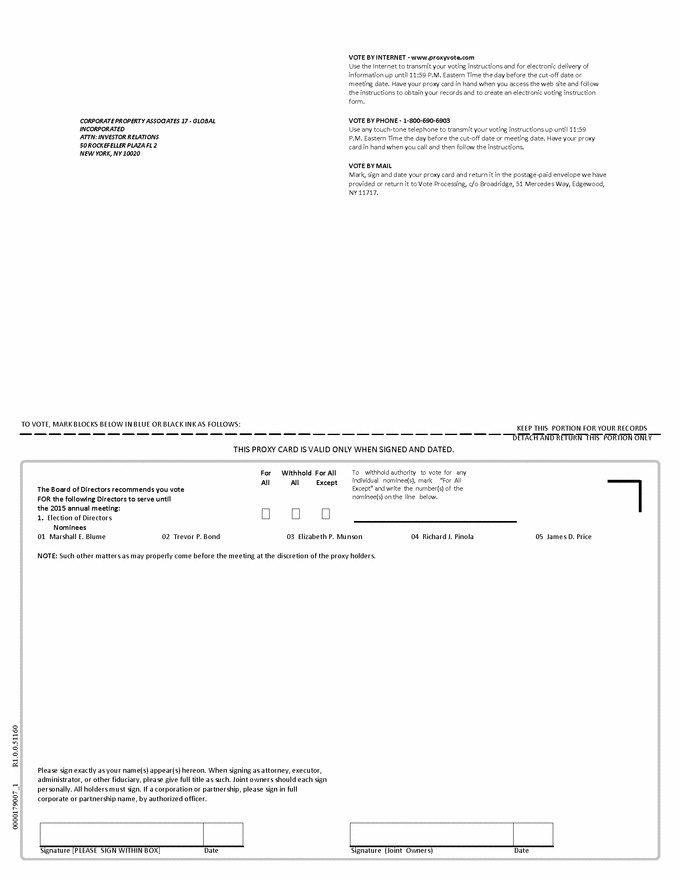 CORPORATE PROPERTY ASSOCIATES 17 - GLOBAL INCORPORATED ATTN: INVESTOR RELATIONS 50 ROCKEFELLER PLAZA FL 2 NEW YORK, NY 10020 VOTE BY INTERNET - www.proxyvote.com Use the Internet to transmit your voting instructions and for electronic delivery of information up until 11:59 P.M. Eastern Time the day before the cut-off date or meeting date. Have your proxy card in hand when you access the web site and follow the instructions to obtain your records and to create an electronic voting instruction form. VOTE BY PHONE - 1-800-690-6903 Use any touch-tone telephone to transmit your voting instructions up until 11:59 P.M. Eastern Time the day before the cut-off date or meeting date. Have your proxy card in hand when you call and then follow the instructions. VOTE BY MAIL Mark, sign and date your proxy card and return it in the postage-paid envelope we have provided or return it to Vote Processing, c/o Broadridge, 51 Mercedes Way, Edgewood, NY 11717. TO VOTE, MARK BLOCKS BELOW IN BLUE OR BLACK INK AS FOLLOWS: THIS PROXY CARD IS VALID ONLY WHEN SIGNED AND DATED. KEEP THIS PORTION FOR YOUR RECORDS DETACH AND RETURN THIS PORTION ONLY The Board of Directors recommends you vote FOR the following Directors to serve until For Withhold For All All All Except To withhold authority to vote for any individual nominee(s), mark “For All Except” and write the number(s) of the nominee(s) on the line below. the 2015 annual meeting: 1. Election of Directors Nominees 01 Marshall E. Blume 02 Trevor P. Bond 03 Elizabeth P. Munson 04 Richard J. Pinola 05 James D. Price NOTE: Such other matters as may properly come before the meeting at the discretion of the proxy holders. Please sign exactly as your name(s) appear(s) hereon. When signing as attorney, executor, administrator, or other fiduciary, please give full title as such. Joint owners should each sign personally. All holders must sign. If a corporation or partnership, please sign in full corporate or partnership name, by authorized officer. 0000179007_1 R1.0.0.51160 Signature [PLEASE SIGN WITHIN BOX] Date Signature (Joint Owners) Date |
