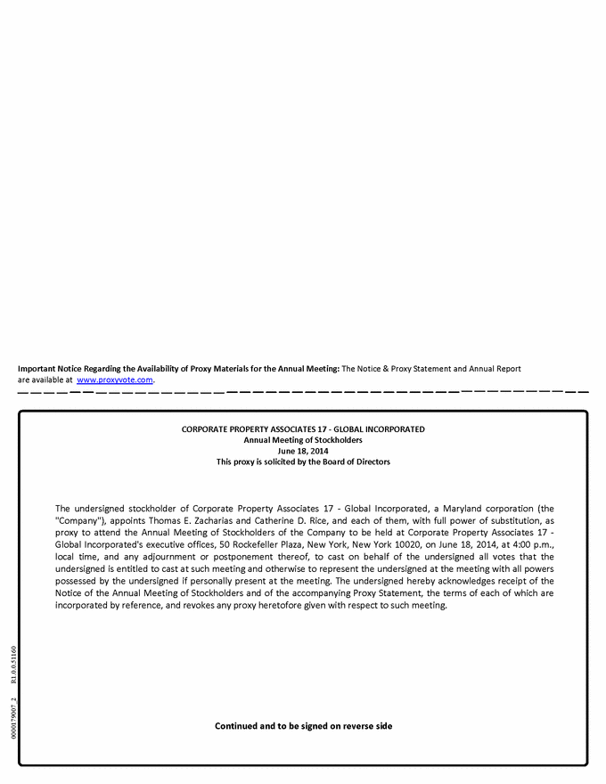 0000179007_2 R1.0.0.51160 Important Notice Regarding the Availability of Proxy Materials for the Annual Meeting: The Notice & Proxy Statement and Annual Report are available at www.proxyvote.com. CORPORATE PROPERTY ASSOCIATES 17 - GLOBAL INCORPORATED Annual Meeting of Stockholders June 18, 2014 This proxy is solicited by the Board of Directors The undersigned stockholder of Corporate Property Associates 17 - Global Incorporated, a Maryland corporation (the "Company"), appoints Thomas E. Zacharias and Catherine D. Rice, and each of them, with full power of substitution, as proxy to attend the Annual Meeting of Stockholders of the Company to be held at Corporate Property Associates 17 - Global Incorporated's executive offices, 50 Rockefeller Plaza, New York, New York 10020, on June 18, 2014, at 4:00 p.m., local time, and any adjournment or postponement thereof, to cast on behalf of the undersigned all votes that the undersigned is entitled to cast at such meeting and otherwise to represent the undersigned at the meeting with all powers possessed by the undersigned if personally present at the meeting. The undersigned hereby acknowledges receipt of the Notice of the Annual Meeting of Stockholders and of the accompanying Proxy Statement, the terms of each of which are incorporated by reference, and revokes any proxy heretofore given with respect to such meeting. Continued and to be signed on reverse side |