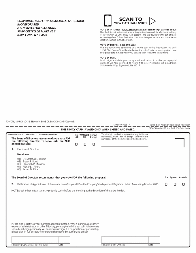 TO VOTE, MARK BLOCKS BELOW IN BLUE OR BLACK INK AS FOLLOWS: KEEP THIS PORTION FOR YOUR RECORDS DETACH AND RETURN THIS PORTION ONLY THIS PROXY CARD IS VALID ONLY WHEN SIGNED AND DATED. Signature [PLEASE SIGN WITHIN BOX] Date Signature (Joint Owners) Date w SCAN TO VIEW MATERIALS & VOTE CORPORATE PROPERTY ASSOCIATES 17 - GLOBAL INCORPORATED ATTN: INVESTOR RELATIONS 50 ROCKEFELLER PLAZA FL 2 NEW YORK, NY 10020 VOTE BY INTERNET - www.proxyvote.com or scan the QR Barcode above Use the Internet to transmit your voting instructions and for electronic delivery of information up until 11:59 P.M. Eastern Time the day before the cut-off date or meeting date. Follow the instructions to obtain your records and to create an electronic voting instruction form. VOTE BY PHONE - 1-800-690-6903 Use any touch-tone telephone to transmit your voting instructions up until 11:59 P.M. Eastern Time the day before the cut-off date or meeting date. Have your proxy card in hand when you call and then follow the instructions. VOTE BY MAIL Mark, sign and date your proxy card and return it in the postage-paid envelope we have provided or return it to Vote Processing, c/o Broadridge, 51 Mercedes Way, Edgewood, NY 11717. M93149-P66517 To withhold authority to vote for any individual nominee(s), mark “For All Except” and write the number(s) of the nominee(s) on the line below. CORPORATE PROPERTY ASSOCIATES 17 - GLOBAL INCORPORATED For All Withhold All For All Except The Board of Directors recommends you vote FOR the following Directors to serve until the 2016 annual meeting: ! ! ! 1. Election of Directors Nominees: 01) Dr. Marshall E. Blume 02) Trevor P. Bond 03) Elizabeth P. Munson 04) Richard J. Pinola 05) James D. Price The Board of Directors recommends that you vote FOR the following proposal: Abstain For Against ! ! ! 2. Ratification of Appointment of PricewaterhouseCoopers LLP as the Company's Independent Registered Public Accounting Firm for 2015. NOTE: Such other matters as may properly come before the meeting at the discretion of the proxy holders. Please sign exactly as your name(s) appear(s) hereon. When signing as attorney, executor, administrator, or other fiduciary, please give full title as such. Joint owners should each sign personally. All holders must sign. If a corporation or partnership, please sign in full corporate or partnership name by authorized officer. |