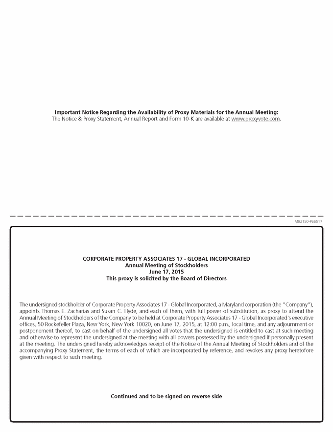 Important Notice Regarding the Availability of Proxy Materials for the Annual Meeting: The Notice & Proxy Statement, Annual Report and Form 10-K are available at www.proxyvote.com. M93150-P66517 CORPORATE PROPERTY ASSOCIATES 17 - GLOBAL INCORPORATED Annual Meeting of Stockholders June 17, 2015 This proxy is solicited by the Board of Directors The undersigned stockholder of Corporate Property Associates 17 - Global Incorporated, a Maryland corporation (the "Company"), appoints Thomas E. Zacharias and Susan C. Hyde, and each of them, with full power of substitution, as proxy to attend the Annual Meeting of Stockholders of the Company to be held at Corporate Property Associates 17 - Global Incorporated's executive offices, 50 Rockefeller Plaza, New York, New York 10020, on June 17, 2015, at 12:00 p.m., local time, and any adjournment or postponement thereof, to cast on behalf of the undersigned all votes that the undersigned is entitled to cast at such meeting and otherwise to represent the undersigned at the meeting with all powers possessed by the undersigned if personally present at the meeting. The undersigned hereby acknowledges receipt of the Notice of the Annual Meeting of Stockholders and of the accompanying Proxy Statement, the terms of each of which are incorporated by reference, and revokes any proxy heretofore given with respect to such meeting. Continued and to be signed on reverse side |
