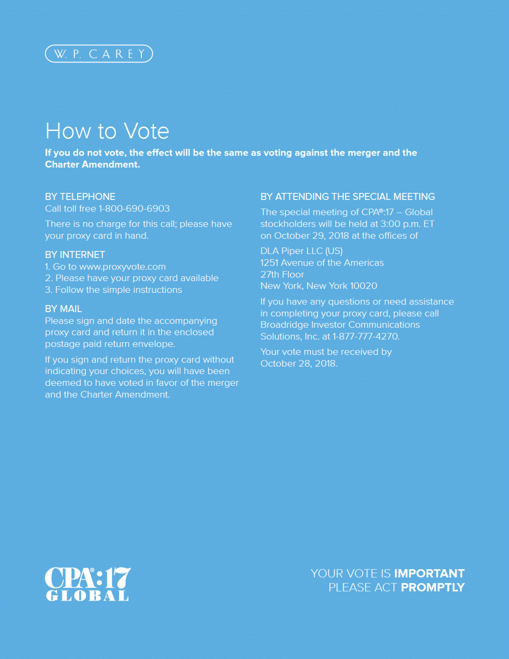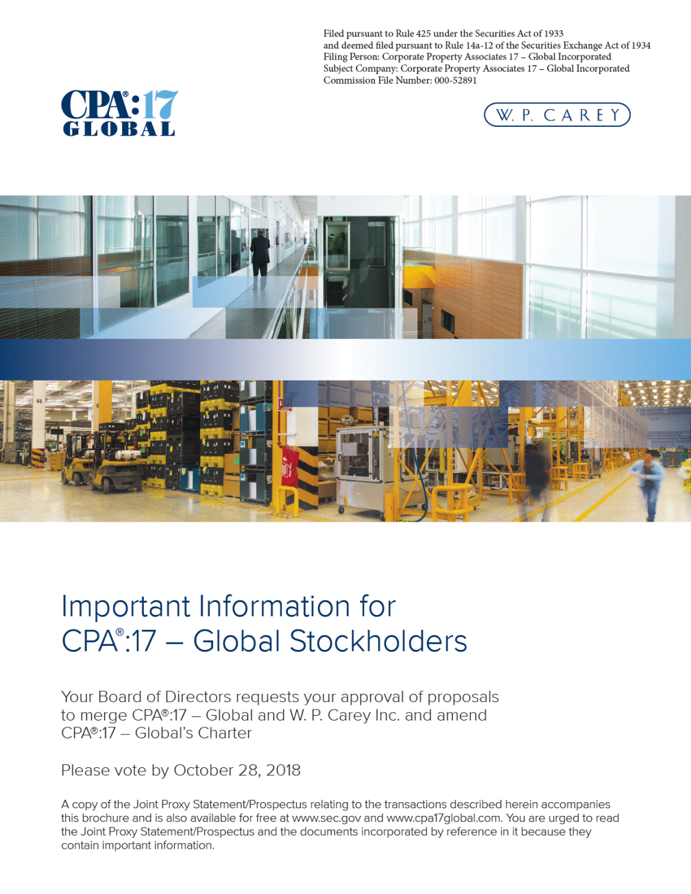 Filed pursuant to Rule 425 under the Securities Act of 1933 and deemed filed pursuant to Rule 14a-12 of the Securities Exchange Act of 1934 Filing Person: Corporate Property Associates 17 – Global Incorporated Subject Company: Corporate Property Associates 17 – Global Incorporated Commission File Number: 000-52891 Important Information for CPA®:17 – Global Stockholders Your Board of Directors requests your approval of proposals to merge CPA®:17 – Global and W. P. Carey Inc. and amend CPA®:17 – Global’s Charter Please vote by October 28, 2018 A copy of the Joint Proxy Statement/Prospectus relating to the transactions described herein accompanies this brochure and is also available for free at www.sec.gov and www.cpa17global.com. You are urged to read the Joint Proxy Statement/Prospectus and the documents incorporated by reference in it because they contain important information.