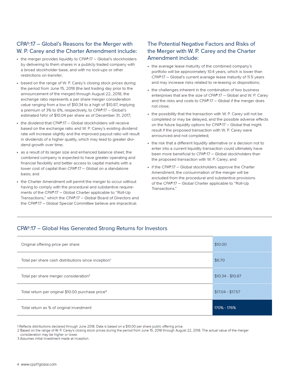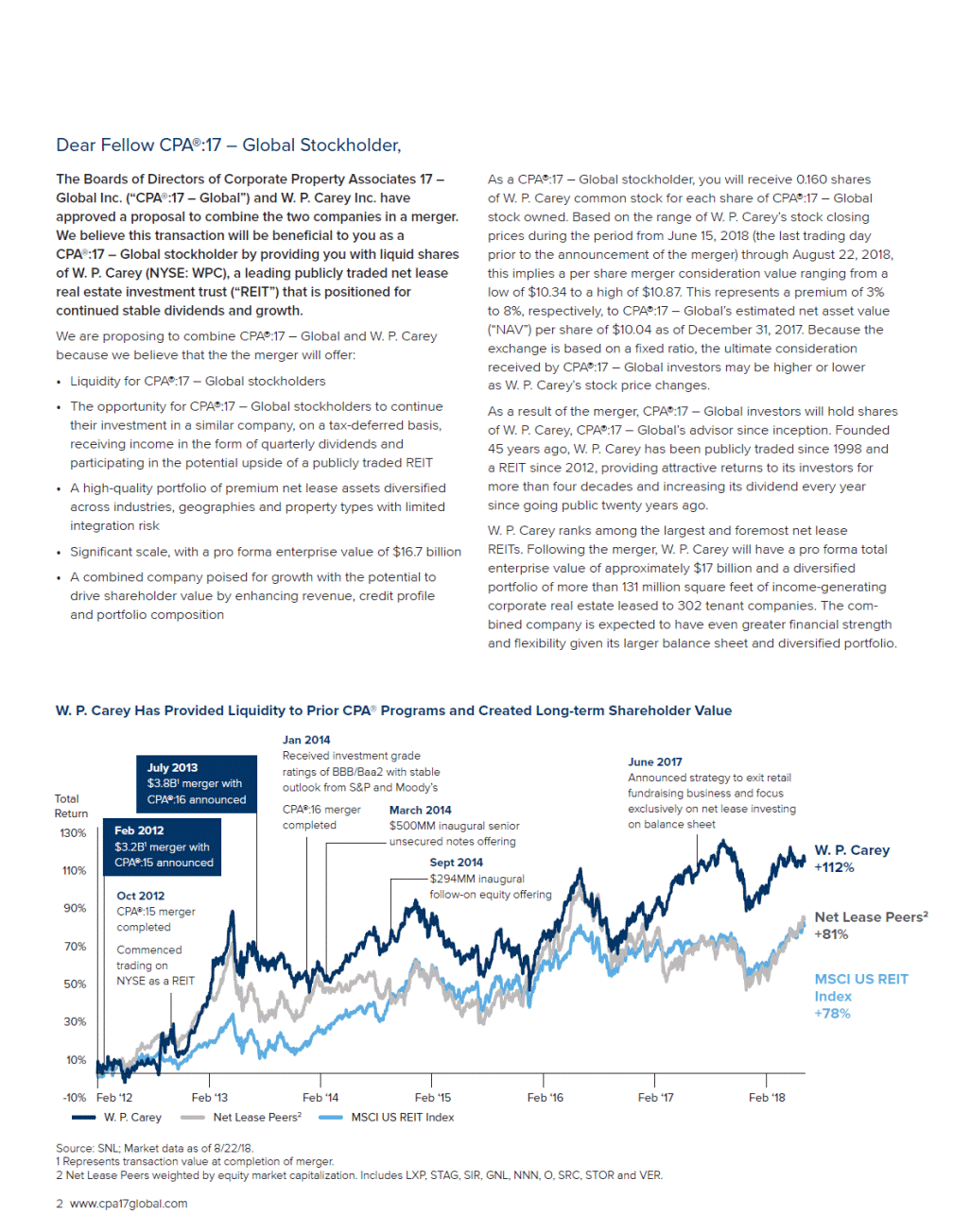 Dear Fellow CPA®:17 – Global Stockholder, The Boards of Directors of Corporate Property Associates 17 – Global Inc. (“CPA®:17 – Global”) and W. P. Carey Inc. have approved a proposal to combine the two companies in a merger. We believe this transaction will be beneficial to you as a CPA®:17 – Global stockholder by providing you with liquid shares of W. P. Carey (NYSE: WPC), a leading publicly traded net lease real estate investment trust (“REIT”) that is positioned for continued stable dividends and growth. We are proposing to combine CPA®:17 – Global and W. P. Carey because we believe that the the merger will offer: As a CPA®:17 – Global stockholder, you will receive 0.160 shares of W. P. Carey common stock for each share of CPA®:17 – Global stock owned. Based on the range of W. P. Carey’s stock closing prices during the period from June 15, 2018 (the last trading day prior to the announcement of the merger) through August 22, 2018, this implies a per share merger consideration value ranging from a low of $10.34 to a high of $10.87. This represents a premium of 3% to 8%, respectively, to CPA®:17 – Global’s estimated net asset value (“NAV”) per share of $10.04 as of December 31, 2017. Because the exchange is based on a fixed ratio, the ultimate consideration received by CPA®:17 – Global investors may be higher or lower as W. P. Carey’s stock price changes. As a result of the merger, CPA®:17 – Global investors will hold shares of W. P. Carey, CPA®:17 – Global’s advisor since inception. Founded 45 years ago, W. P. Carey has been publicly traded since 1998 and a REIT since 2012, providing attractive returns to its investors for more than four decades and increasing its dividend every year since going public twenty years ago. W. P. Carey ranks among the largest and foremost net lease REITs. Following the merger, W. P. Carey will have a pro forma total enterprise value of approximately $17 billion and a diversified portfolio of more than 131 million square feet of income-generating corporate real estate leased to 302 tenant companies. The com-bined company is expected to have even greater financial strength and flexibility given its larger balance sheet and diversified portfolio. • • Liquidity for CPA®:17 – Global stockholders The opportunity for CPA®:17 – Global stockholders to continue their investment in a similar company, on a tax-deferred basis, receiving income in the form of quarterly dividends and participating in the potential upside of a publicly traded REIT A high-quality portfolio of premium net lease assets diversified across industries, geographies and property types with limited integration risk Significant scale, with a pro forma enterprise value of $16.7 billion A combined company poised for growth with the potential to drive shareholder value by enhancing revenue, credit profile and portfolio composition • • • W. P. Carey Has Provided Liquidity to Prior CPA® Programs and Created Long-term Shareholder Value Jan 2014 Received investment grade ratings of BBB/Baa2 with stable outlook from S&P and Moody’s June 2017 Announced strategy to exit retail fundraising business and focus exclusively on net lease investing Total Return 130% CPA®:16 merger March 2014 W. P. Carey +112% 110% 90% Net Lease Peers2 +81% 70% MSCI US REIT Index +78% 50% 30% 10% -10% Feb ‘12 W. P. Carey Feb ‘13 Feb ‘14 Feb ‘15 MSCI US REIT Index Feb ‘16 Feb ‘17 Feb ‘18 Net Lease Peers2 Source: SNL; Market data as of 8/22/18. 1 Represents transaction value at completion of merger. 2 Net Lease Peers weighted by equity market capitalization. Includes LXP, STAG, SIR, GNL, NNN, O, SRC, STOR and VER. 2 www.cpa17global.com Feb $3.2B1 merger with CPA®:15 announced completed$500MM inaugural senior on balance sheet unsecured notes offering Sept 2014 $294MM inaugural Octfollow-on equity offering CPA®:15 merger completed Commenced trading on NYSE as a REIT July 2013 $3.8B1 merger with CPA®:16 announced 2012 2012