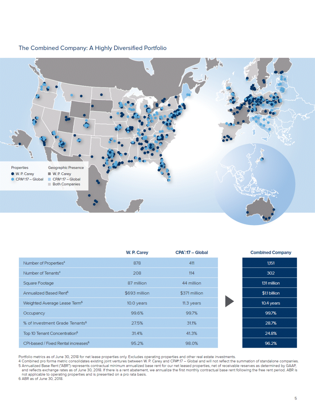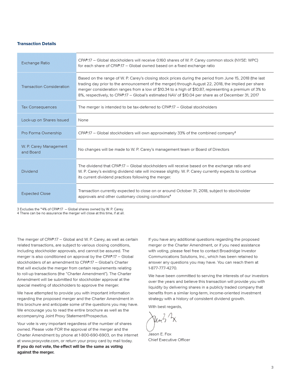 Transaction Details for each share of CPA®:17 – Global owned based on a fixed exchange ratio merger consideration ranges from a low of $10.34 to a high of $10.87, representing a premium of 3% to approvals and other customary closing conditions4 3 Excludes the ~4% of CPA®:17 – Global shares owned by W. P. Carey. 4 There can be no assurance the merger will close at this time, if at all. The merger of CPA®:17 – Global and W. P. Carey, as well as certain related transactions, are subject to various closing conditions, including stockholder approvals, and cannot be assured. The merger is also conditioned on approval by the CPA®:17 – Global stockholders of an amendment to CPA®:17 – Global’s Charter that will exclude the merger from certain requirements relating to roll-up transactions (the “Charter Amendment”). The Charter Amendment will be submitted for stockholder approval at the special meeting of stockholders to approve the merger. We have attempted to provide you with important information regarding the proposed merger and the Charter Amendment in this brochure and anticipate some of the questions you may have. We encourage you to read the entire brochure as well as the accompanying Joint Proxy Statement/Prospectus. Your vote is very important regardless of the number of shares owned. Please vote FOR the approval of the merger and the Charter Amendment by phone at 1-800-690-6903, on the internet at www.proxyvote.com, or return your proxy card by mail today. If you do not vote, the effect will be the same as voting against the merger. If you have any additional questions regarding the proposed merger or the Charter Amendment, or if you need assistance with voting, please feel free to contact Broadridge Investor Communications Solutions, Inc., which has been retained to answer any questions you may have. You can reach them at 1-877-777-4270. We have been committed to serving the interests of our investors over the years and believe this transaction will provide you with liquidity by delivering shares in a publicly traded company that benefits from a similar long-term, income-oriented investment strategy with a history of consistent dividend growth. With best regards, Jason E. Fox Chief Executive Officer 3 Exchange Ratio CPA®:17 – Global stockholders will receive 0.160 shares of W. P. Carey common stock (NYSE: WPC) Transaction Consideration Based on the range of W. P. Carey’s closing stock prices during the period from June 15, 2018 (the last trading day prior to the announcement of the merger) through August 22, 2018, the implied per share 8%, respectively, to CPA®:17 – Global’s estimated NAV of $10.04 per share as of December 31, 2017 Tax Consequences The merger is intended to be tax-deferred to CPA®:17 – Global stockholders Lock-up on Shares Issued None Pro Forma Ownership CPA®:17 – Global stockholders will own approximately 33% of the combined company3 W. P. Carey Management and Board No changes will be made to W. P. Carey’s management team or Board of Directors Dividend Expected Close The dividend that CPA®:17 – Global stockholders will receive based on the exchange ratio and W. P. Carey’s existing dividend rate will increase slightly. W. P. Carey currently expects to continue its current dividend practices following the merger. Transaction currently expected to close on or around October 31, 2018, subject to stockholder