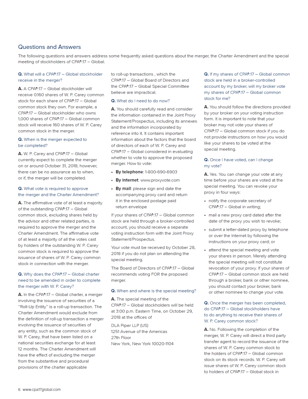 Questions and Answers The following questions and answers address some frequently asked questions about the merger, the Charter Amendment and the special meeting of stockholders of CPA®:17 – Global. Q. What will a CPA®:17 – Global stockholder receive in the merger? A. A CPA®:17 – Global stockholder will receive 0.160 shares of W. P. Carey common stock for each share of CPA®:17 – Global common stock they own. For example, a CPA®:17 – Global stockholder who owns 1,000 shares of CPA®:17 – Global common stock will receive 160 shares of W. P. Carey common stock in the merger. Q. When is the merger expected to be completed? A. W. P. Carey and CPA®:17 – Global currently expect to complete the merger on or around October 31, 2018; however, there can be no assurance as to when, or if, the merger will be completed. to roll-up transactions , which the CPA®:17 – Global Board of Directors and the CPA®:17 – Global Special Committee believe are impractical. Q. What do I need to do now? A. You should carefully read and consider the information contained in the Joint Proxy Statement/Prospectus, including its annexes and the information incorporated by reference into it. It contains important information about the factors that the board of directors of each of W. P. Carey and CPA®:17 – Global considered in evaluating whether to vote to approve the proposed merger. How to vote: Q. If my shares of CPA®:17 – Global common stock are held in a broker-controlled account by my broker, will my broker vote my shares of CPA®:17 – Global common stock for me? A. You should follow the directions provided by your broker on your voting instruction form. It is important to note that your broker may not vote your shares of CPA®:17 – Global common stock if you do not provide instructions on how you would like your shares to be voted at the special meeting. Q. Once I have voted, can I change my vote? A. Yes. You can change your vote at any time before your shares are voted at the special meeting. You can revoke your proxy in four ways: • • • By telephone: 1-800-690-6903 By internet: www.proxyvote.com By mail: please sign and date the accompanying proxy card and return it in the enclosed postage paid return envelope Q. What vote is required to approve the merger and the Charter Amendment? A. The affirmative vote of at least a majority of the outstanding CPA®:17 – Global common stock, excluding shares held by the advisor and other related parties, is required to approve the merger and the Charter Amendment. The affirmative vote of at least a majority of all the votes cast by holders of the outstanding W. P. Carey common stock is required to approve the issuance of shares of W. P. Carey common stock in connection with the merger. • notify the corporate secretary of CPA®:17 – Global in writing; mail a new proxy card dated after the date of the proxy you wish to revoke; submit a letter-dated proxy by telephone or over the Internet by following the instructions on your proxy card; or attend the special meeting and vote your shares in person. Merely attending the special meeting will not constitute revocation of your proxy. If your shares of CPA®:17 – Global common stock are held through a broker, bank or other nominee, you should contact your broker, bank or other nominee to change your vote. If your shares of CPA®:17 – Global common stock are held through a broker-controlled account, you should receive a separate voting instruction form with the Joint Proxy Statement/Prospectus. Your vote must be received by October 28, 2018 if you do not plan on attending the special meeting. The Board of Directors of CPA®:17 – Global recommends voting FOR the proposed merger. • • • Q. Why does the CPA®:17 – Global charter need to be amended in order to complete the merger with W. P. Carey? A. In the CPA®:17 – Global charter, a merger involving the issuance of securities of a ‘‘Roll-Up Entity’’ is a roll-up transaction. The Charter Amendment would exclude from the definition of roll-up transaction a merger involving the issuance of securities of any entity, such as the common stock of W. P. Carey, that have been listed on a national securities exchange for at least 12 months. The Charter Amendment will have the effect of excluding the merger from the substantive and procedural provisions of the charter applicable Q. When and where is the special meeting? A. The special meeting of the CPA®:17 – Global stockholders will be held at 3:00 p.m. Eastern Time, on October 29, 2018 at the offices of DLA Piper LLP (US) 1251 Avenue of the Americas 27th Floor New York, New York 10020-1104 Q. Once the merger has been completed, do CPA®:17 – Global stockholders have to do anything to receive their shares of W. P. Carey common stock? A. No. Following the completion of the merger, W. P. Carey will direct a third party transfer agent to record the issuance of the shares of W. P. Carey common stock to the holders of CPA®:17 – Global common stock on its stock records. W. P. Carey will issue shares of W. P. Carey common stock to holders of CPA®:17 – Global stock in 6 www.cpa17global.com