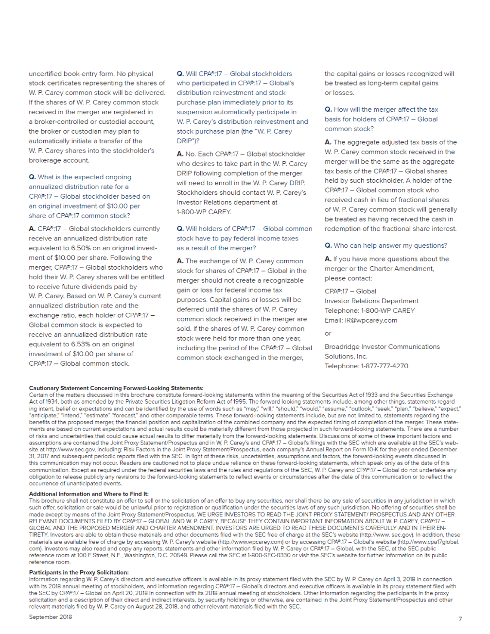 uncertified book-entry form. No physical stock certificates representing the shares of W. P. Carey common stock will be delivered. If the shares of W. P. Carey common stock received in the merger are registered in a broker-controlled or custodial account, the broker or custodian may plan to automatically initiate a transfer of the W. P. Carey shares into the stockholder’s brokerage account. Q. Will CPA®:17 – Global stockholders who participated in CPA®:17 – Global’s distribution reinvestment and stock purchase plan immediately prior to its suspension automatically participate in W. P. Carey’s distribution reinvestment and stock purchase plan (the “W. P. Carey DRIP”)? A. No. Each CPA®:17 – Global stockholder who desires to take part in the W. P. Carey DRIP following completion of the merger will need to enroll in the W. P. Carey DRIP. Stockholders should contact W. P. Carey’s Investor Relations department at 1-800-WP CAREY. the capital gains or losses recognized will be treated as long-term capital gains or losses. Q. How will the merger affect the tax basis for holders of CPA®:17 – Global common stock? A. The aggregate adjusted tax basis of the W. P. Carey common stock received in the merger will be the same as the aggregate tax basis of the CPA®:17 – Global shares held by such stockholder. A holder of the CPA®:17 – Global common stock who received cash in lieu of fractional shares of W. P. Carey common stock will generally be treated as having received the cash in redemption of the fractional share interest. Q. What is the expected ongoing annualized distribution rate for a CPA®:17 – Global stockholder based on an original investment of $10.00 per share of CPA®:17 common stock? A. CPA®:17 – Global stockholders currently receive an annualized distribution rate equivalent to 6.50% on an original invest-ment of $10.00 per share. Following the merger, CPA®:17 – Global stockholders who hold their W. P. Carey shares will be entitled to receive future dividends paid by W. P. Carey. Based on W. P. Carey’s current annualized distribution rate and the exchange ratio, each holder of CPA®:17 – Global common stock is expected to receive an annualized distribution rate equivalent to 6.53% on an original investment of $10.00 per share of CPA®:17 – Global common stock. Q. Will holders of CPA®:17 – Global common stock have to pay federal income taxes as a result of the merger? A. The exchange of W. P. Carey common stock for shares of CPA®:17 – Global in the merger should not create a recognizable gain or loss for federal income tax purposes. Capital gains or losses will be deferred until the shares of W. P. Carey common stock received in the merger are sold. If the shares of W. P. Carey common stock were held for more than one year, including the period of the CPA®:17 – Global common stock exchanged in the merger, Q. Who can help answer my questions? A. If you have more questions about the merger or the Charter Amendment, please contact: CPA®:17 – Global Investor Relations Department Telephone: 1-800-WP CAREY Email: IR@wpcarey.com or Broadridge Investor Communications Solutions, Inc. Telephone: 1-877-777-4270 Cautionary Statement Concerning Forward-Looking Statements: Certain of the matters discussed in this brochure constitute forward-looking statements within the meaning of the Securities Act of 1933 and the Securities Exchange Act of 1934, both as amended by the Private Securities Litigation Reform Act of 1995. The forward-looking statements include, among other things, statements regard-ing intent, belief or expectations and can be identified by the use of words such as “may,” “will,” “should,” “would,” “assume,” “outlook,” “seek,” “plan,” “believe,” “expect,” “anticipate,” “intend,” “estimate” “forecast,” and other comparable terms. These forward-looking statements include, but are not limited to, statements regarding the benefits of the proposed merger, the financial position and capitalization of the combined company and the expected timing of completion of the merger. These state-ments are based on current expectations and actual results could be materially different from those projected in such forward-looking statements. There are a number of risks and uncertainties that could cause actual results to differ materially from the forward-looking statements. Discussions of some of these important factors and assumptions are contained the Joint Proxy Statement/Prospectus and in W. P. Carey’s and CPA®:17 – Global’s filings with the SEC which are available at the SEC’s web-site at http://www.sec.gov, including: Risk Factors in the Joint Proxy Statement/Prospectus, each company’s Annual Report on Form 10-K for the year ended December 31, 2017 and subsequent periodic reports filed with the SEC. In light of these risks, uncertainties, assumptions and factors, the forward-looking events discussed in this communication may not occur. Readers are cautioned not to place undue reliance on these forward-looking statements, which speak only as of the date of this communication. Except as required under the federal securities laws and the rules and regulations of the SEC, W. P. Carey and CPA®:17 – Global do not undertake any obligation to release publicly any revisions to the forward-looking statements to reflect events or circumstances after the date of this communication or to reflect the occurrence of unanticipated events. Additional Information and Where to Find It: This brochure shall not constitute an offer to sell or the solicitation of an offer to buy any securities, nor shall there be any sale of securities in any jurisdiction in which such offer, solicitation or sale would be unlawful prior to registration or qualification under the securities laws of any such jurisdiction. No offering of securities shall be made except by means of the Joint Proxy Statement/Prospectus. WE U