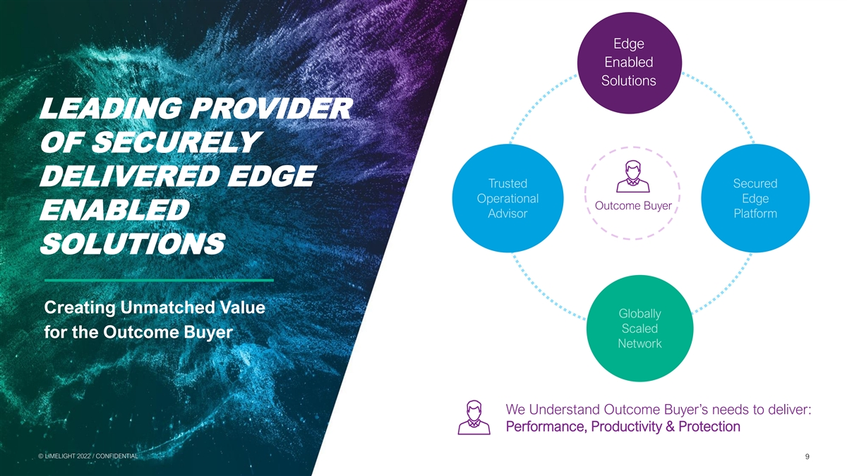 THE RISE OF THE OUTCOME BUYER TODAY’S CLOUD SERVICE GIANTS CATER PRIMARILY TO TOOL BUYERS THERE IS A LARGE CUSTOMER SEGMENT THAT WOULD PREFER TO BUY OUTCOMES OUTCOME BUYERS ~17% OF TAM ▪ Seek robust features and functions from each tool▪ Seek integrated solutions that deliver outcomes ▪ Self-reliant to integrate & customize tools▪ A mix of managed and self-service usage models ▪ Usage based packaging & pricing▪ Simplified and inclusive packaging & pricing ▪ Requires increasingly scarce in-house know-how▪ Reduces reliance on in-house know-how © © L LIIM ME EL LIIG GH HT T 2 20 02 22 2 / / C CON ONFI FID DE EN NT TIIA AL L 8 8