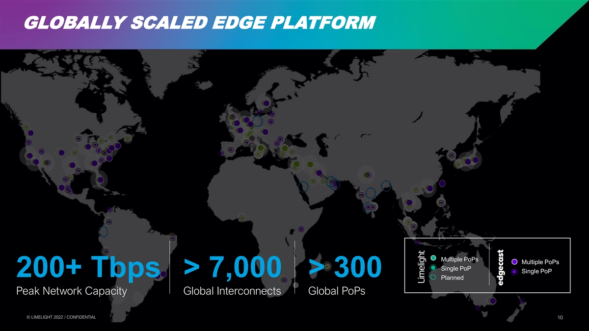 GLOBALLY SCALED EDGE PLATFORM Multiple PoPs Multiple PoPs Single PoP Single PoP 200+ Tbps > 7,000 > 300 Planned Peak Network Capacity Global Interconnects Global PoPs © © L LIIM ME EL LIIG GH HT T 2 20 02 22 2 / / C CON ONFI FID DE EN NT TIIA AL L 10 10