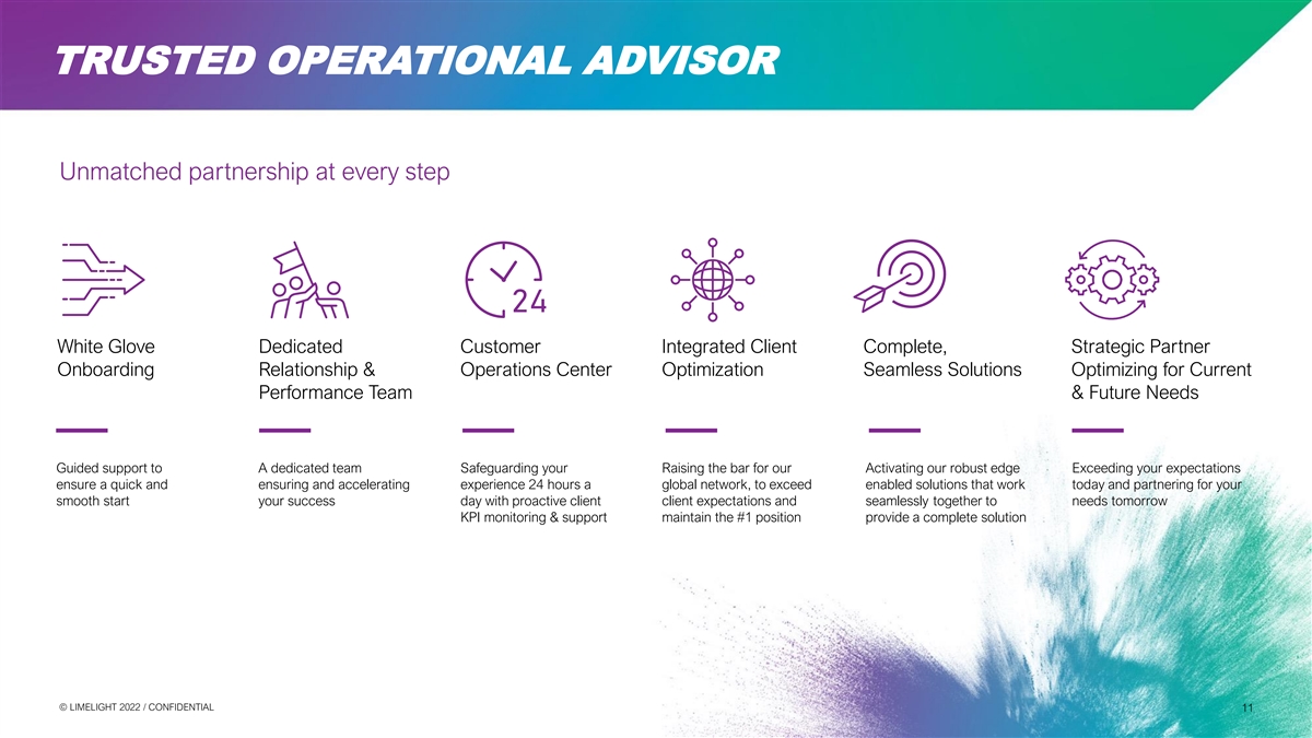 TRUSTED OPERATIONAL ADVISOR Unmatched partnership at every step White Glove Dedicated Customer Integrated Client Complete, Strategic Partner Onboarding Relationship & Operations Center Optimization Seamless Solutions Optimizing for Current Performance Team & Future Needs Guided support to A dedicated team Safeguarding your Raising the bar for our Activating our robust edge Exceeding your expectations ensure a quick and ensuring and accelerating experience 24 hours a global network, to exceed enabled solutions that work today and partnering for your smooth start your success day with proactive client client expectations and seamlessly together to needs tomorrow KPI monitoring & support maintain the #1 position provide a complete solution © © L LIIM ME EL LIIG GH HT T 2 20 02 22 2 / / C CON ONFI FID DE EN NT TIIA AL L 11 11