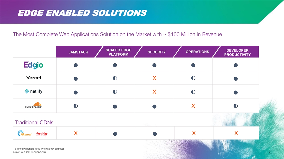 EDGE ENABLED SOLUTIONS The Most Complete Web Applications Solution on the Market with ~ $100 Million in Revenue SCALED EDGE DEVELOPER OPERATIONS SECURITY JAMSTACK PLATFORM PRODUCTIVITY ●●●●● ◐ X◐ ●● ◐ X◐ ●● ◐ X◐ ●● Traditional CDNs X X X ●● Select competitors listed for illustration purposes © © L LIIM ME EL LIIG GH HT T 2 20 02 22 2 / / C CON ONFI FID DE EN NT TIIA AL L 12 12