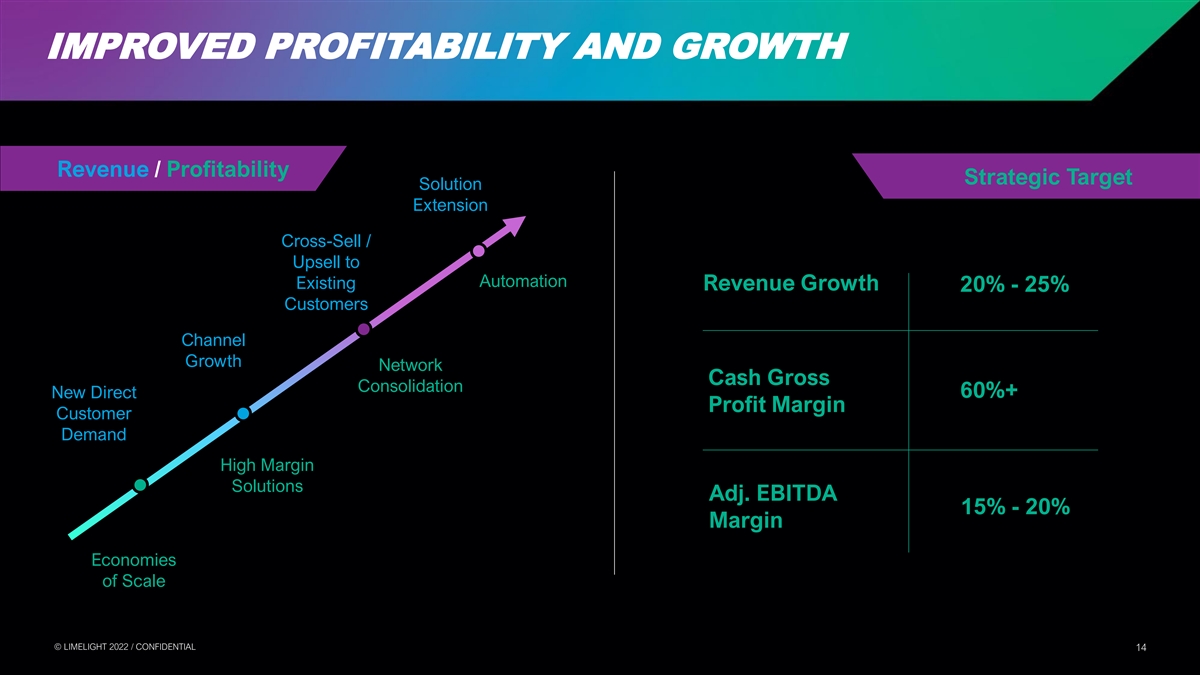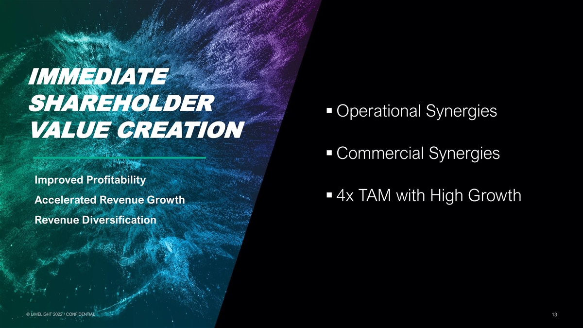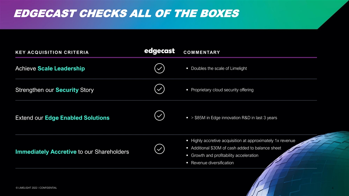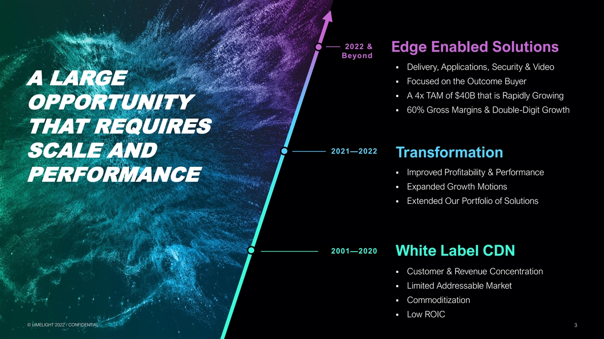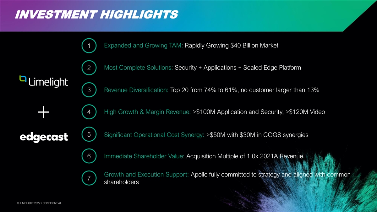 FORWARD-LOOKING STATEMENTS Cautionary Note Regarding Forward-Looking Statements To the extent any statements made in this communication contain information that is not historical, these statements are forward-looking statements within the meaning of Section 27A of the U.S. Securities Act of 1933, as amended, and Section 21E of the U.S. Securities Exchange Act of 1934, as amended (collectively, “forward-looking statements”). Certain statements in this communication may constitute forward-looking statements, which reflect the expectations of Limelight’s management regarding the business prospects and opportunities of Limelight and the transaction. The use of words such as “may,” “will,” “could,” “should,” “expects,” “intends,” “plans,” “anticipates,” “believes,” “estimates,” “predicts,” “projects,” “seeks,” “endeavor,” “potential,” “continue” or the negative of such words or other similar expressions can be used to identify forward-looking statements. Limelight’s actual results could differ materially from those stated or implied in forward-looking statements due to a number of factors including but not limited to risks related to the satisfaction or waiver of the conditions to closing the proposed transaction (including the failure to obtain necessary regulatory, court and Limelight’s stockholder approvals) in the anticipated timeframe or at all, including the possibility that the proposed transaction does not close; the response of customers, business partners and competitors to the announcement of the proposed transaction, and/or potential difficulties in employee retention as a result of the announcement and pendency of the proposed transaction; the possibility of significant unexpected transaction costs; risks associated with the disruption of management’s attention from ongoing business operations due to the proposed transaction; the company’s ability to achieve projected revenue increase, to realize run-rate cost synergy opportunities and/or market expansion fail to meet expectations; and unknown liabilities and the risk of litigation and/or regulatory actions related to the proposed transaction. Please also refer to the factors discussed under “Risk Factors” and “Special Note Regarding Forward-looking Information” in Limelight’s Annual Report on Form 10-K for the year ended December 31, 2021, with the U.S. Securities Exchange Commission (“SEC”), each as updated by Limelight’s continuous disclosure filings, which are available at www.sec.gov. Forward-looking statements involve significant risks and uncertainties, should not be read as guarantees of future performance or results, and will not necessarily be accurate indications of whether or not or the times at or by which such performance or results will be achieved. All forward-looking statements herein are qualified in their entirety by its cautionary statement and are made as of the date of this communication. Limelight disclaims any obligation to revise or update any such forward-looking statements or to publicly announce the result of any revisions to any of the forward-looking statements contained herein to reflect future results, events or developments, except as required by law. Additional Information and Where to Find It This communication is not intended to and does not constitute an offer to sell or the solicitation of an offer to subscribe for or buy or an invitation to purchase or subscribe for any securities or the solicitation of any vote, consent or approval in any jurisdiction, nor shall there by any sale, issuance or transfer of securities in any jurisdiction in contravention of applicable law. This communication has been prepared in respect of the proposed transaction involving Limelight and Edgecast pursuant to the terms of the definitive agreement, and may be deemed to be soliciting material relating to the transaction. In connection with the transaction, Limelight will file a proxy statement on Schedule 14A relating to a special meeting of the stockholders with the SEC. Additionally, Limelight will file other relevant materials in connection with the transaction with the SEC. Investors and securityholders of Limelight are urged to read the proxy statement and/or consent solicitation documents regarding the transaction and any other relevant materials carefully in their entirety when they become available before making any voting or investment decision with respect to the transaction because they will contain important information about the transaction and the parties to the definitive agreement. The definitive proxy statement will be mailed to holders of Limelight’s stock. Stockholders will be able to obtain a copy of the proxy statement, as well as other filings containing information about the transaction and the parties to the definitive agreement made by Limelight with the SEC free of charge on EDGAR at www.sec.gov, or on Limelight’s website at www.limelight.com. Information contained on, or that may be accessed through, the websites referenced in this communication is not incorporated into and does not constitute a part of this communication. We have included these website addresses only as inactive textual references and do not intend them to be active links. Participants in the Solicitation Limelight and its directors and executive officers may be deemed to be participants in the solicitation of proxies from the stockholders of Limelight in respect of the transaction. Information about Limelight’s directors and executive officers is set forth in the proxy statement for Limelight’s 2021 Annual Meeting of Stockholders, which was filed with the SEC on April 23, 2021. Investors may obtain additional information regarding the interest of such participants by reading the proxy statement regarding the transaction when it becomes available. © © L LIIM ME EL LIIG GH HT T 2 20 02 22 2 / / C CON ONFI FID DE EN NT