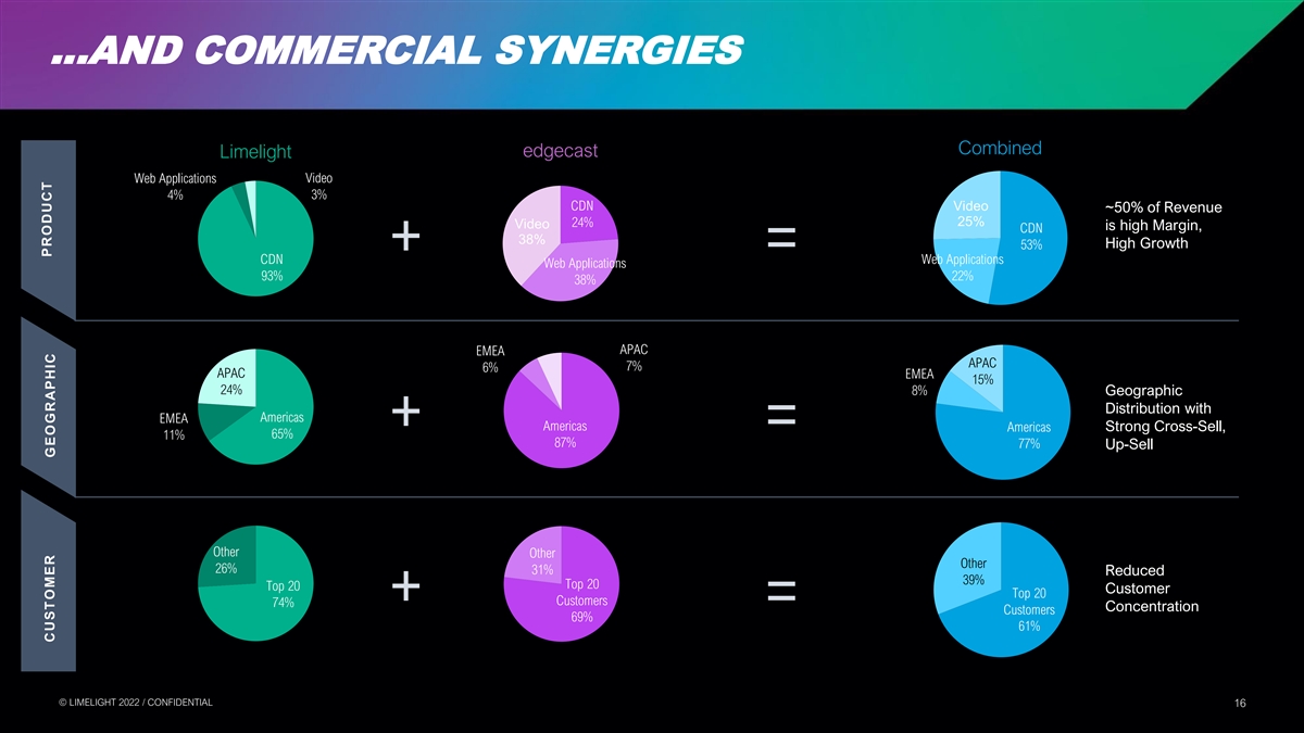 UNDERWRITTEN WITH STRONG OPERATIONAL SYNERGIES Gross Margin Synergies 14% ▪ Colocation expense in shared POP locations ▪ Internet peering ▪ Duplicative Operational Support 40% Operational Synergies $50M ▪ Network Performance & Efficiency RUN RATE COST SYNERGIES ▪ OpEx Leverage ▪ Client Support Economies of Scale 46% Commercial Synergies ▪ Cross- and up-sell to existing customers ▪ Improved solution features ▪ Acceleration of secure edge access Peering Colocation OpEx © © L LIIM ME EL LIIG GH HT T 2 20 02 22 2 / / C CON ONFI FID DE EN NT TIIA AL L 15 15
