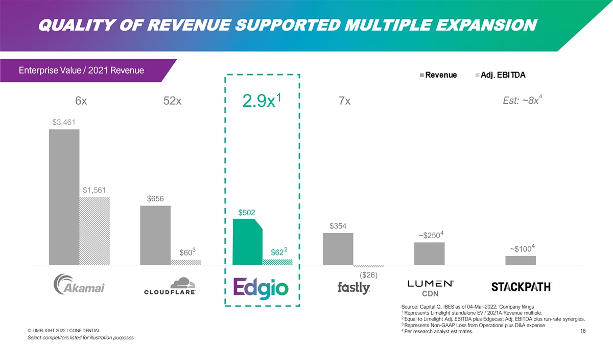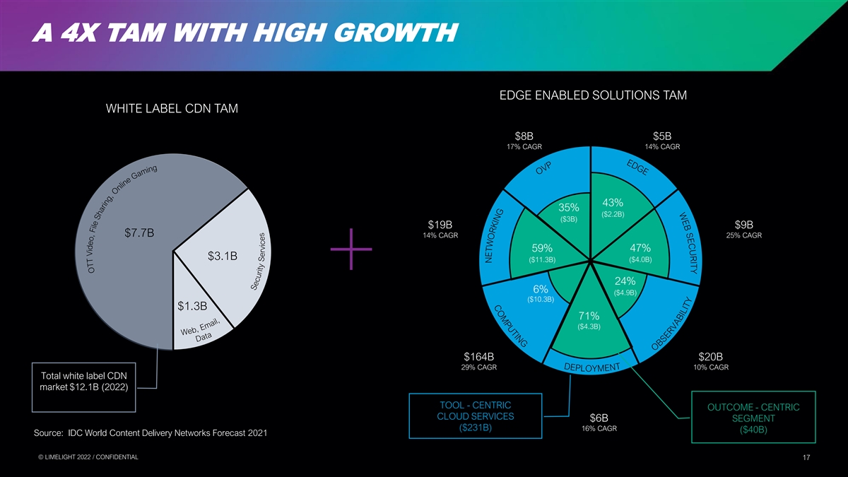 A 4X TAM WITH HIGH GROWTH EDGE ENABLED SOLUTIONS TAM WHITE LABEL CDN TAM $8B $5B 17% CAGR 14% CAGR 43% 35% ($2.2B) ($3B) $19B $9B $7.7B 14% CAGR 25% CAGR 59% 47% $3.1B ($11.3B) ($4.0B) 24% 6% ($4.9B) ($10.3B) $1.3B 71% ($4.3B) $164B $20B 29% CAGR 10% CAGR Total white label CDN market $12.1B (2022) TOOL - CENTRIC OUTCOME - CENTRIC CLOUD SERVICES $6B SEGMENT ($231B) 16% CAGR ($40B) Source: IDC World Content Delivery Networks Forecast 2021 © © L LIIM ME EL LIIG GH HT T 2 20 02 22 2 / / C CON ONFI FID DE EN NT TIIA AL L 17 17