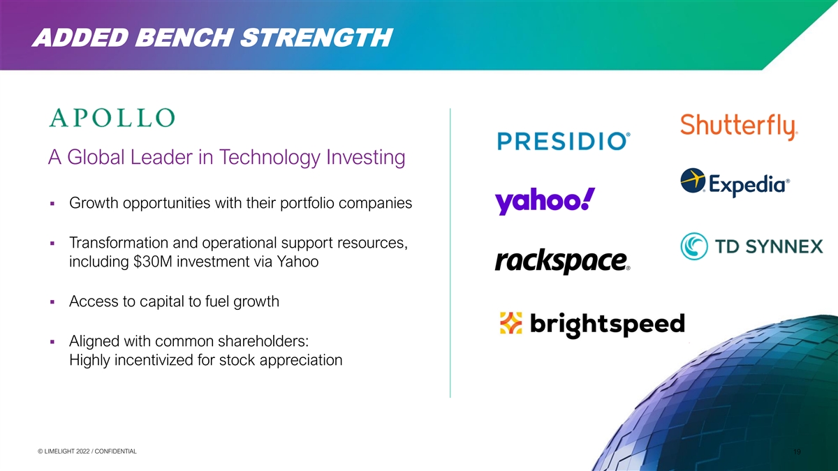 ADDED BENCH STRENGTH A Global Leader in Technology Investing ▪ Growth opportunities with their portfolio companies ▪ Transformation and operational support resources, including $30M investment via Yahoo ▪ Access to capital to fuel growth ▪ Aligned with common shareholders: Highly incentivized for stock appreciation 1 © © L LIIM ME EL LIIG GH HT T 2 20 02 22 2 / / C CON ONFI FID DE EN NT TIIA AL L Calculated as Pro Forma Basic Share Outstanding * (First Earnout Tranche Price less Current Share Price) 19 19