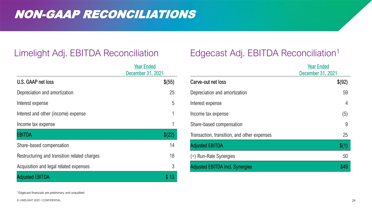 NON-GAAP RECONCILIATIONS 1 Limelight Adj. EBITDA Reconciliation Edgecast Adj. EBITDA Reconciliation Year Ended Year Ended December 31, 2021 December 31, 2021 U.S. GAAP net loss $(55) Carve-out net loss $(92) Depreciation and amortization 25 Depreciation and amortization 59 Interest expense 5 Interest expense 4 Interest and other (income) expense 1 Income tax expense (5) Income tax expense 1 Share-based compensation 9 EBITDA $(22) Transaction, transition, and other expenses 25 Share-based compensation 14 Adjusted EBITDA $(1) Restructuring and transition related charges 18 (+) Run-Rate Synergies 50 Acquisition and legal related expenses 3 Adjusted EBITDA incl. Synergies $49 Adjusted EBITDA $ 13 1 Edgecast financials are preliminary and unaudited © © L LIIM ME EL LIIG GH HT T 2 20 02 22 2 / / C CON ONFI FID DE EN NT TIIA AL L 24 24