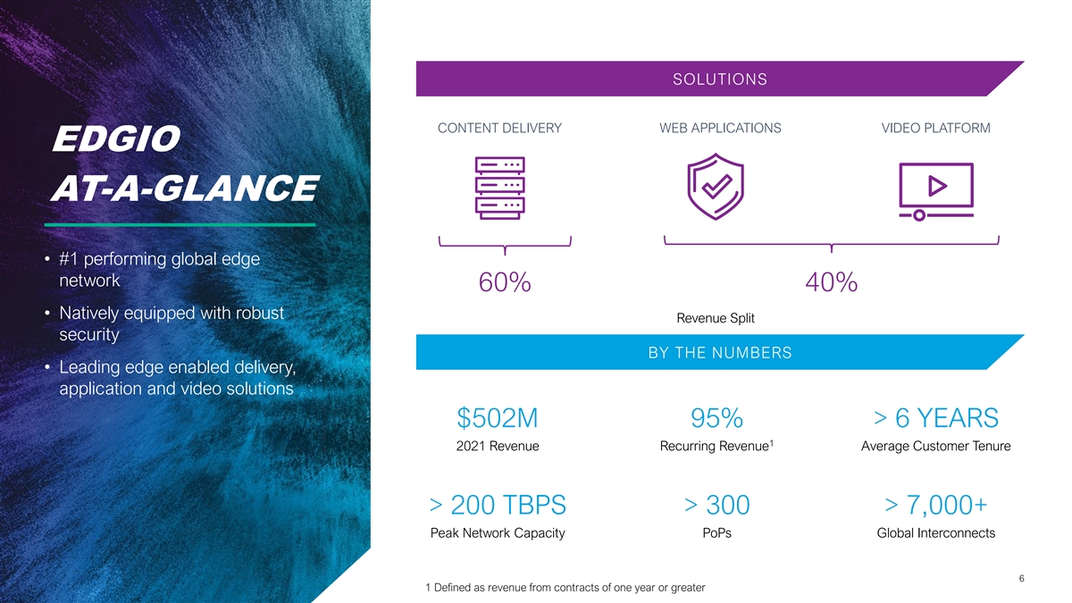 TRANSACTION SUMMARY ▪ Upfront deal value of approximately $300 million ▪ Price includes a $30 million investment by Apollo Global Management and their co-investors through their ownership of Yahoo ▪ Funded by the issuance of approximately 72.2 million shares of Limelight common stock based on the 30-day VWAP of approximately $4.12 (Reference Price) to Yahoo, subject to customary adjustments at closing Structure ▪ Shares subject to 24 month lock up period ▪ Yahoo to receive up to $100 million in additional shares based on stock performance; $33 million at achievement of each share price threshold of 150%, 200% and 250% of the Reference Price ▪ Pro forma equity ownership approximately 68.1% existing Limelight shareholders, 31.9% Yahoo Ownership and Board ▪ Board will be reconstructed to include 6 Limelight appointed seats and 3 Apollo appointed seats with equity ownership at or above 28%, two seats if/when ownership is between 27-17%, one seat if/when ownership is between 16-10% ▪ Greater than $50 million run-rate cost synergies Identified Synergies ▪ Meaningful commercial synergy opportunities ▪ Target closing second half of 2022, subject to customary closing conditions and regulatory approvals Timeline ▪ Limelight rebranding as , combined company to continue as Edgio after close © © L LIIM ME EL LIIG GH HT T 2 20 02 22 2 / / C CON ONFI FID DE EN NT TIIA AL L 5 5
