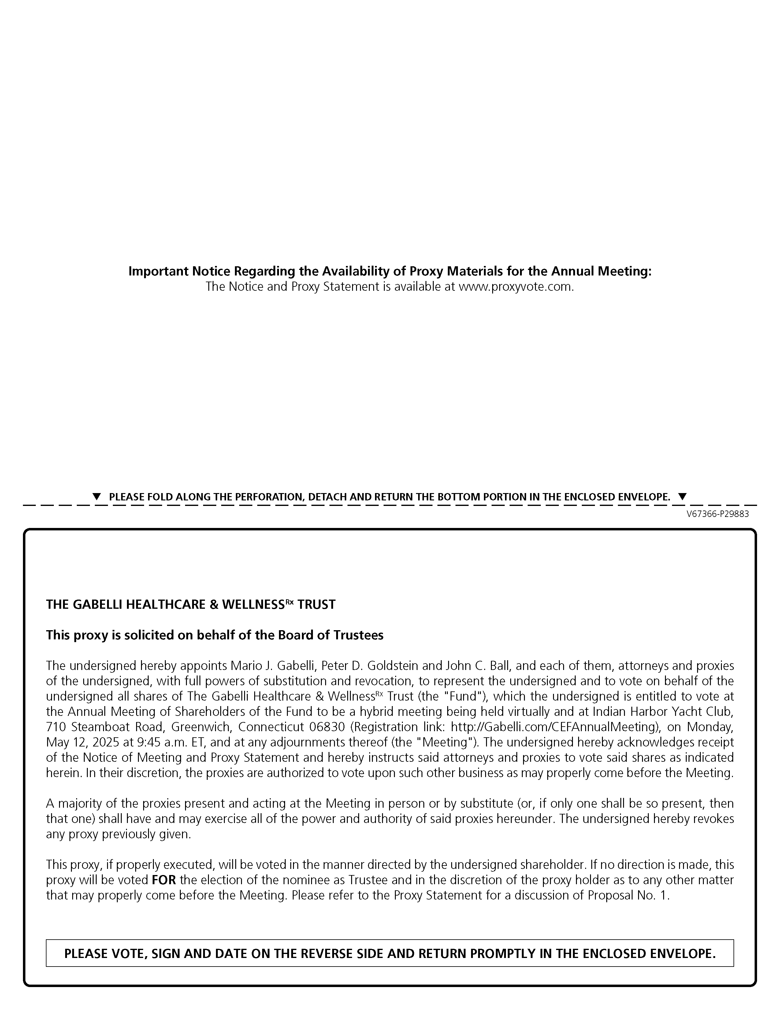 Notice is hereby given that the Annual Meeting of Shareholders of The Gabelli Healthcare & WellnessRx Trust, a Delaware statutory trust (the “Fund”), will be held on Monday, May 12, 2025, at 9:45 a.m., ET, at Indian Harbor Yacht Club, 710 Steamboat Road, Greenwich, Connecticut, 06830 and virtually by Internet webcast (the “Meeting”), and at any adjournments or postponements thereof for the following purposes: