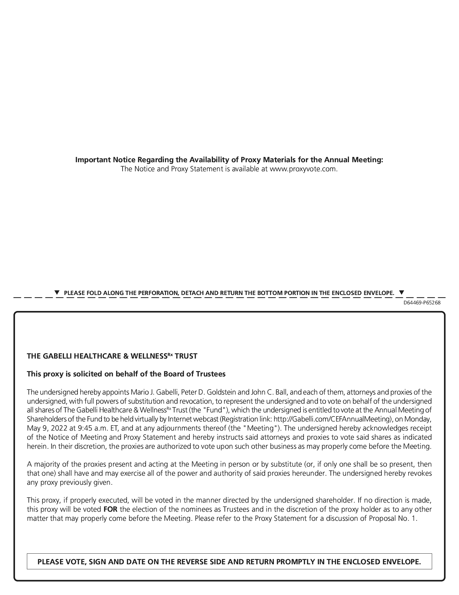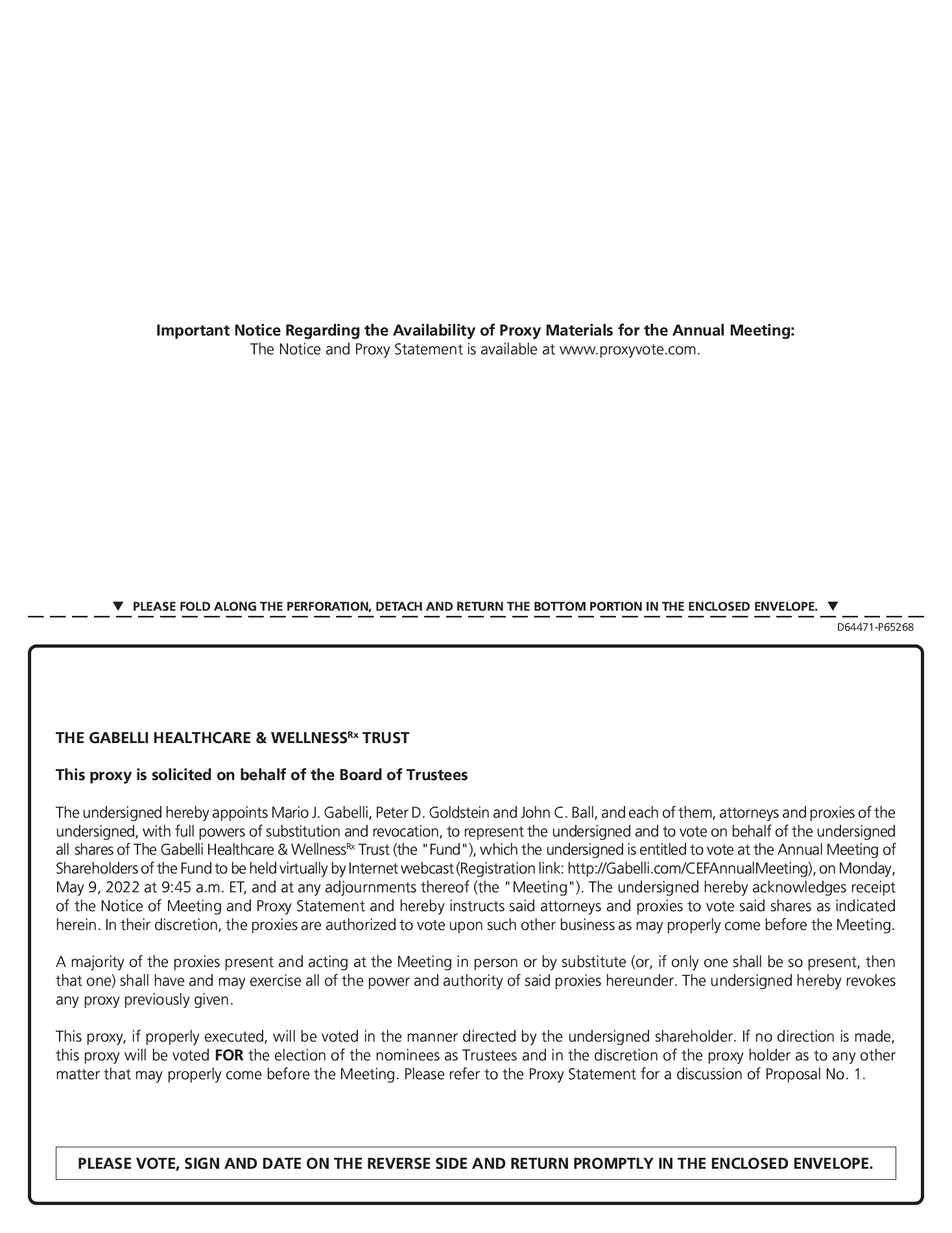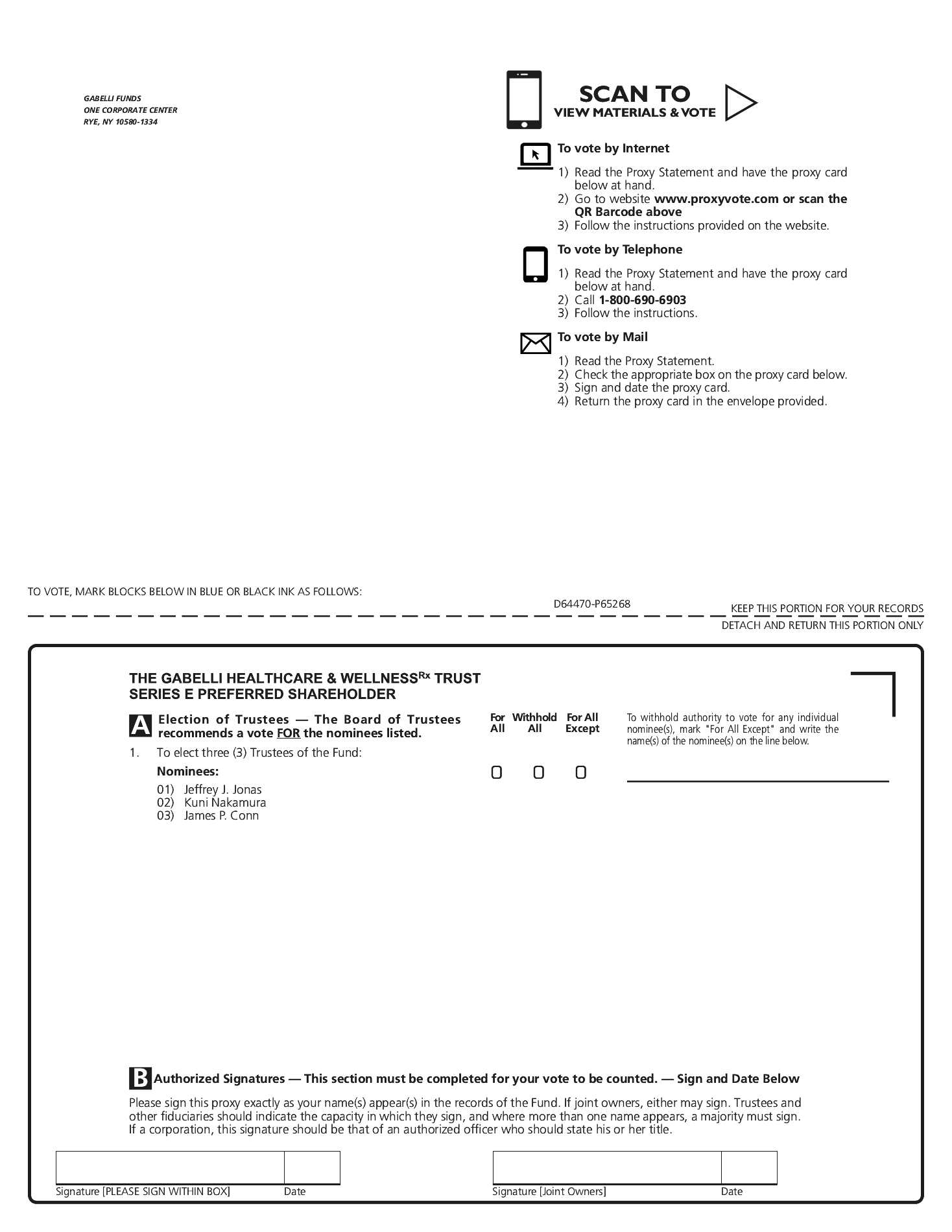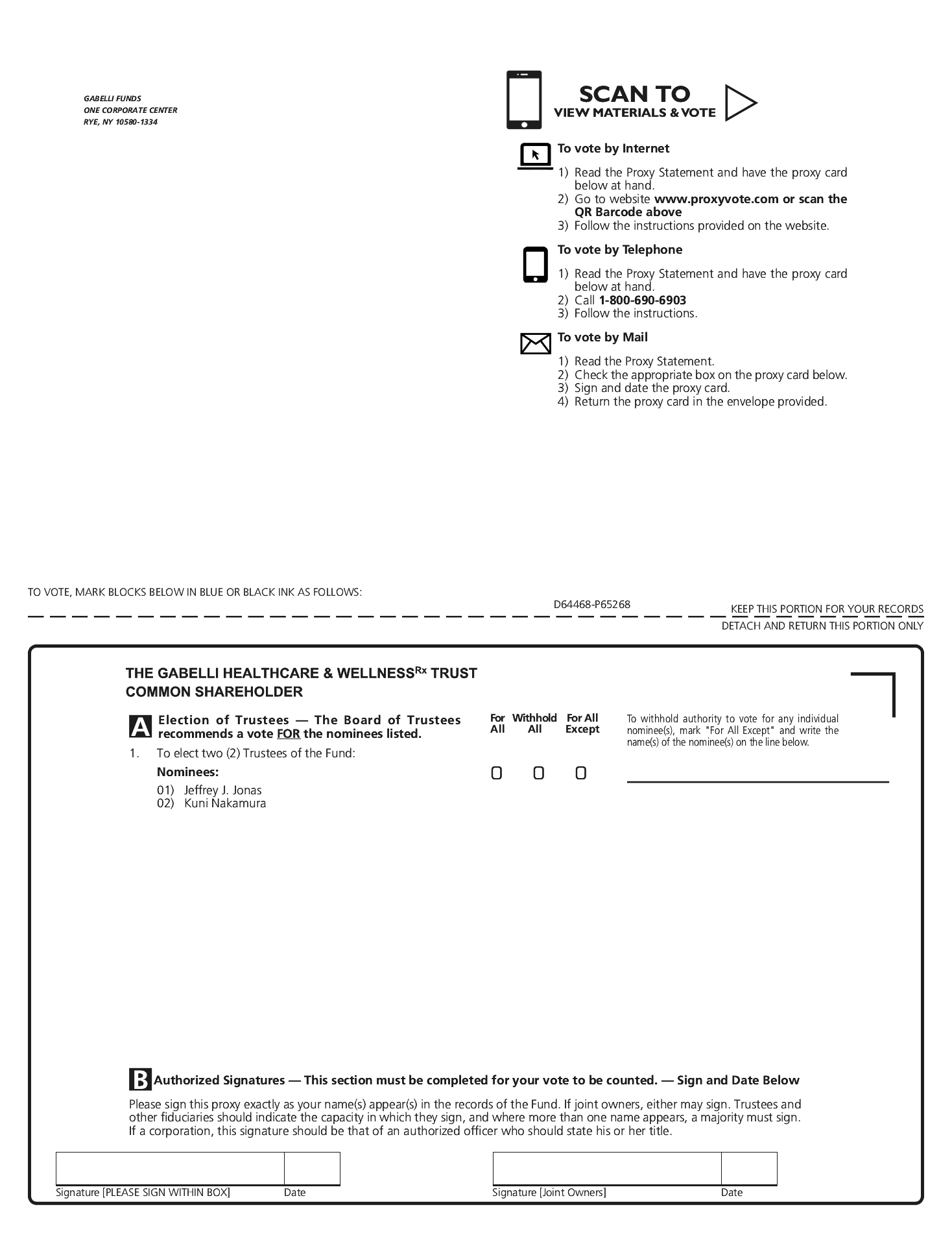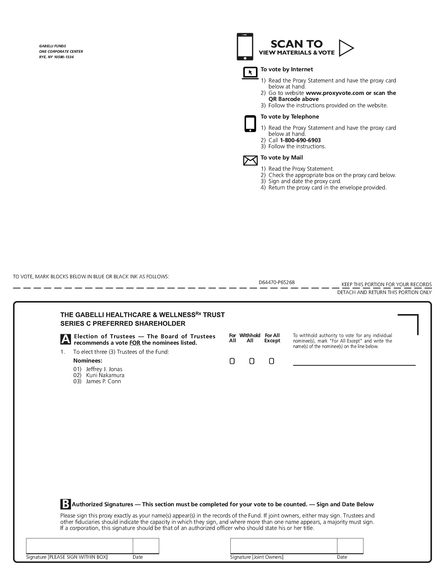 (4) | “Interested person” of the Fund, as defined in the 1940 Act. Messrs. Gabelli and Jonas are each considered to be an “interested person” of the Fund because of their affiliation with the Fund’s Adviser. Ms. Mullady is considered to be an “interested person” of the Fund because of her direct or indirect beneficial interest in the Fund’s Adviser and due to a previous business or professional relationship with the Fund and the Adviser. |