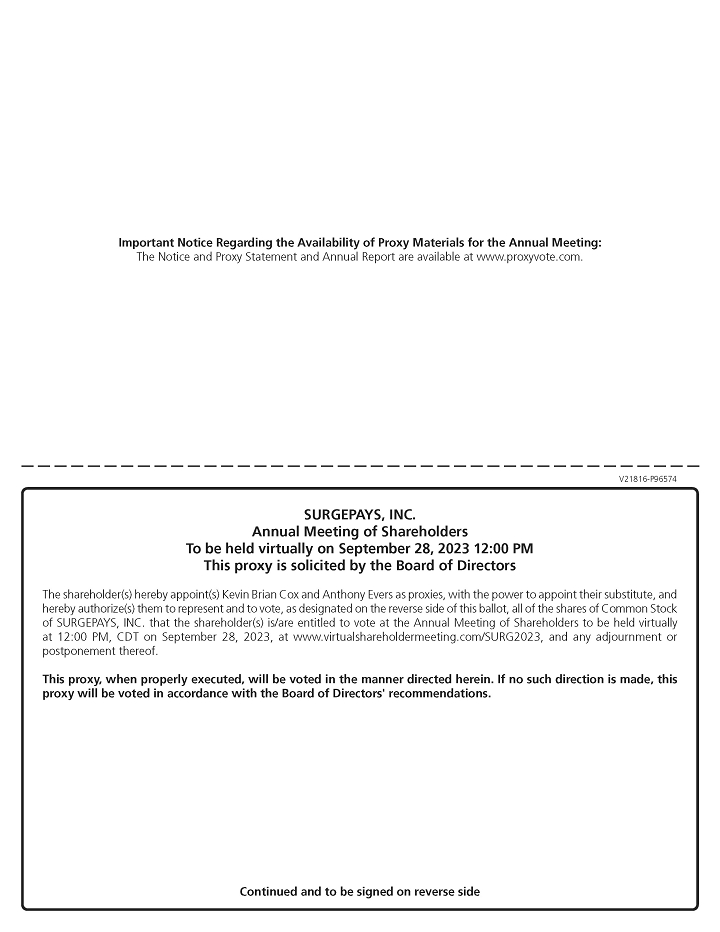 We invite you to attend the 2023 Annual Meeting of Stockholders (the “Annual Meeting”) of SurgePays, Inc. (“SurgePays” or the “Company”), to be held on September 28, 2023 at 12:00 p.m. Central Time virtually by means of remote communication and can be accessed by visiting www.virtualshareholdermeeting.com/SURG2023 where you will be able to listen to the meeting live, submit questions and vote online. You will not be ablet to attend the meeting in person.
