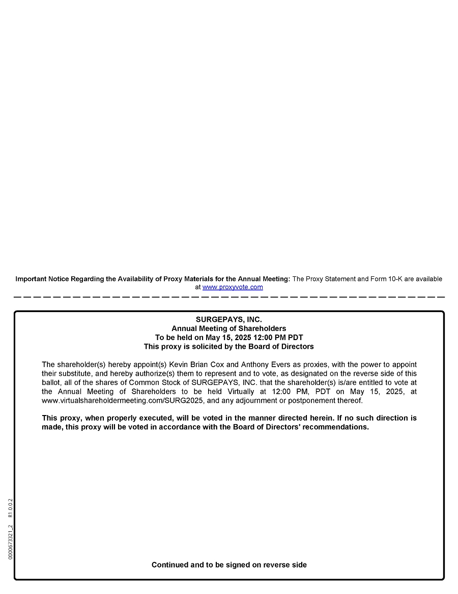 You are cordially invited to attend the 2025 Annual Meeting of Stockholders (the “Annual Meeting”) of SurgePays, Inc. (the “Company”) to be held on a virtual basis on Thursday, May 15, 2025 at 12:00 p.m. Pacific Time, for the following purposes: