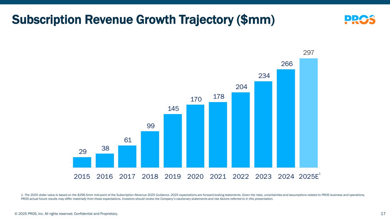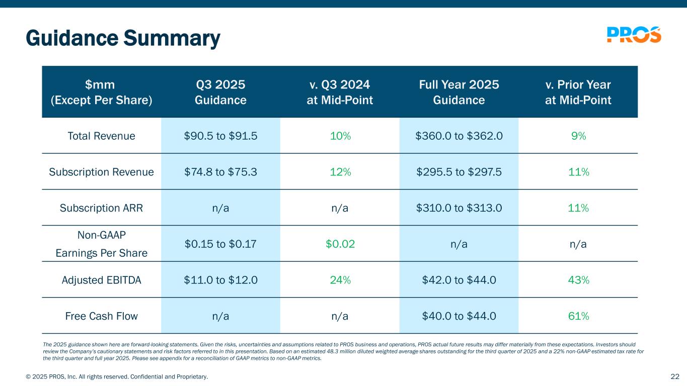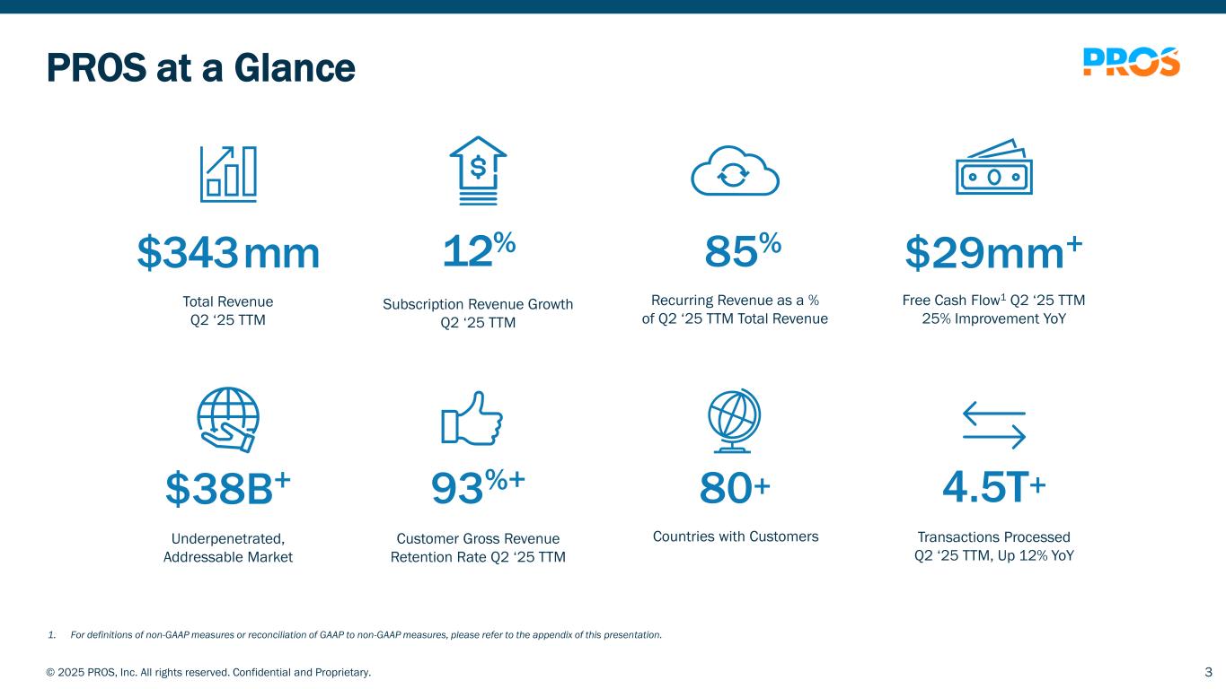 © 2025 PROS, Inc. All rights reserved. Confidential and Proprietary. Disclaimer / Forward-Looking Statements 2 This presentation contains forward-looking statements within the meaning of the Private Securities Litigation Reform Act of 1995, including statements about our financial outlook; expectations; ability to achieve future growth and profitability goals; ability to achieve "Rule of 40“; management's confidence and optimism; positioning; customer successes; demand for our software solutions; pipeline; business expansion; revenue; subscription revenue; subscription ARR; non-GAAP earnings (loss) per share; adjusted EBITDA; free cash flow; shares outstanding and effective tax rate. The forward-looking statements contained in this presentation are based upon our historical performance and our current plans, estimates and expectations and are not a representation that such plans, estimates or expectations will be achieved. Factors that could cause actual results to differ materially from those described herein include, among others, risks related to: (a) cyberattacks, data breaches and breaches of security measures within our products, systems and infrastructure or products, systems and infrastructure of third parties upon whom we rely, (b) the macroeconomic environment and geopolitical uncertainty and events, (c) increasing business from customers, maintaining subscription renewal rates and capturing customer IT spend, (d) managing our growth and profit objectives effectively, (e) disruptions from our third party data center, software, data, and other unrelated service providers, (f) implementing our solutions, (g) cloud operations, (h) intellectual property and third-party software, (i) acquiring and integrating businesses and/or technologies, (j) catastrophic events, (k) operating globally, including economic and commercial disruptions, (l) potential downturns in sales and lengthy sales cycles, (m) software innovation, (n) competition, (o) market acceptance of our software innovations, (p) maintaining our corporate culture, (q) personnel risks including loss of any key employees and competition for talent, (r) expanding and training our direct and indirect sales force, (s) evolving data privacy, cyber security and data localization laws, (t) the rapid adoption, evolution, and understanding of AI, (u) our debt repayment obligations, (v) the timing of revenue recognition and cash flow from operations, and (w) returning to profitability. Additional information relating to the risks and uncertainties affecting our business is contained in our filings with the SEC. These forward-looking statements represent our expectations as of the date hereof. Subsequent events may cause these expectations to change, and PROS disclaims any obligations to update or alter these forward-looking statements in the future, whether as a result of new information, future events or otherwise. This presentation includes certain supplemental non-GAAP financial measures, that we believe are useful to investors as tools for assessing the comparability between periods as well as company by company. Our computation of these measures may not be comparable to other similarly titled measures computed by other companies. These non-GAAP financial measures should be considered in addition to, but not as a substitute for, our financial information and results prepared in accordance with U.S. GAAP included in our periodic filings made with the SEC. Investors are encouraged to review the reconciliation of our historical non-GAAP financial measures to the comparable GAAP results, which can be found, along with other financial information, on the investor relations’ page of our website at PROS.com. We are unable to reconcile forward-looking non-GAAP financial measures to their directly comparable GAAP financial measures because the information needed to complete a reconciliation is unavailable at this time without unreasonable effort.