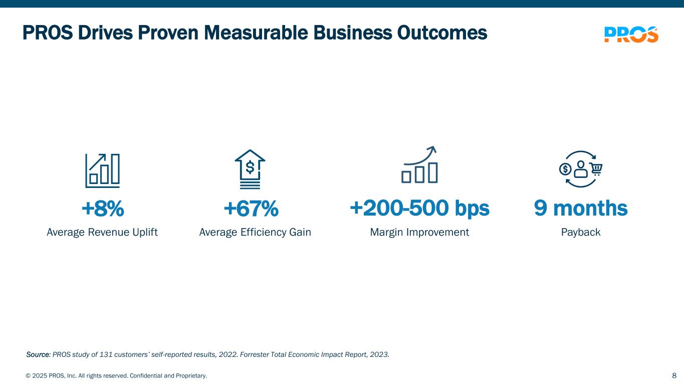 © 2025 PROS, Inc. All rights reserved. Confidential and Proprietary. PROS Drives Proven Measurable Business Outcomes +200-500 bps Margin Improvement Source: PROS study of 131 customers’ self-reported results, 2022. Forrester Total Economic Impact Report, 2023. 9 months Payback +67% Average Efficiency Gain Average Revenue Uplift +8% 8