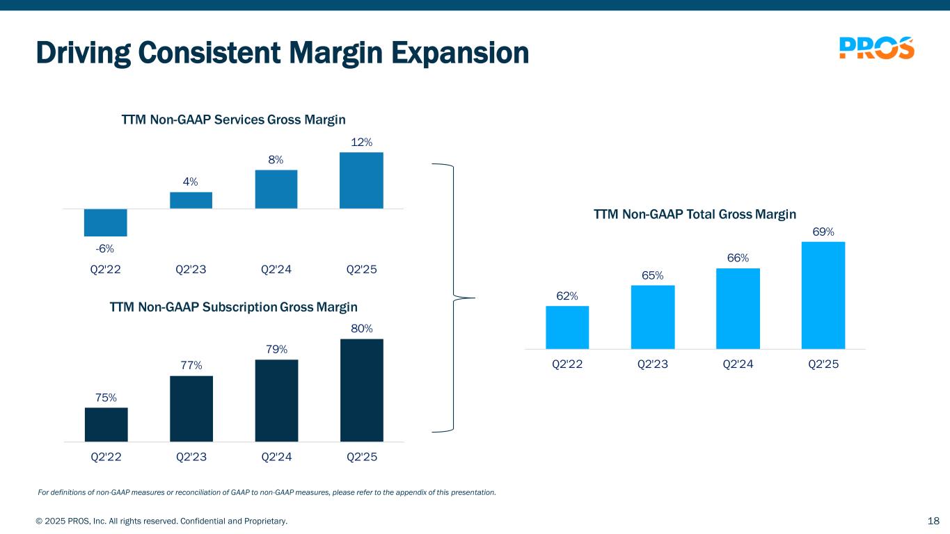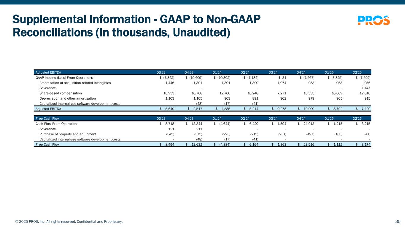 © 2025 PROS, Inc. All rights reserved. Confidential and Proprietary. Gross Profit Q3'23 Q4'23 Q1'24 Q2'24 Q3'24 Q4'24 Q1'25 Q2'25 GAAP Gross Profit $ 48,786 $ 48,748 $ 51,855 $ 53,194 $ 54,404 $ 57,590 $ 58,390 $ 59,520 Amortization of acquisition-related intangibles 1,099 953 953 953 738 629 629 632 Share-based compensation 1,033 1,073 1,068 1,151 1,177 1,180 977 1,104 Non-GAAP Gross Profit $ 50,918 $ 50,774 $ 53,876 $ 55,298 $ 56,319 $ 59,399 $ 59,996 $ 61,256 Non-GAAP Gross Margin 66% 66% 67% 67% 68% 70% 70% 69% Subscription Gross Profit Q3'23 Q4'23 Q1'24 Q2'24 Q3'24 Q4'24 Q1'25 Q2'25 GAAP Subscription Gross Profit $ 45,477 $ 46,214 $ 49,736 $ 51,030 $ 52,598 $ 55,026 $ 56,281 $ 57,897 Amortization of acquisition-related intangibles 1,099 953 953 953 738 629 629 632 Share-based compensation 201 208 202 235 244 239 247 258 Non-GAAP Subscription Gross Profit $ 46,777 $ 47,375 $ 50,891 $ 52,218 $ 53,580 $ 55,894 $ 57,157 $ 58,787 Non-GAAP Subscription Gross Margin 78% 78% 79% 80% 80% 81% 81% 80% Recurring Revenue Gross Profit Q3'23 Q4'23 Q1'24 Q2'24 Q3'24 Q4'24 Q1'25 Q2'25 GAAP Recurring Revenue Gross Profit $ 48,401 $ 48,898 $ 51,469 $ 52,664 $ 54,261 $ 56,463 $ 57,310 $ 58,821 Amortization of acquisition-related intangibles 1,099 953 953 953 738 629 629 632 Share-based compensation 294 301 339 331 342 341 342 351 Non-GAAP Recurring Revenue Gross Profit $ 49,794 $ 50,152 $ 52,761 $ 53,948 $ 55,341 $ 57,433 $ 58,281 $ 59,804 Non-GAAP Recurring Revenue Gross Margin 77% 77% 78% 78% 79% 79% 79% 79% Services Gross Profit Q3'23 Q4'23 Q1'24 Q2'24 Q3'24 Q4'24 Q1'25 Q2'25 GAAP Services Gross Profit $ 385 $ (150) $ 386 $ 530 $ 143 $ 1,127 $ 1,080 $ 699 Share-based compensation 739 772 729 820 835 839 635 753 Non-GAAP Services Gross Profit $ 1,124 $ 622 $ 1,115 $ 1,350 $ 978 $ 1,966 $ 1,715 $ 1,452 Non-GAAP Services Gross Margin 9% 5% 9% 10% 8% 16% 13% 11% Supplemental Information - GAAP to Non-GAAP Reconciliations (In thousands, Unaudited) 34