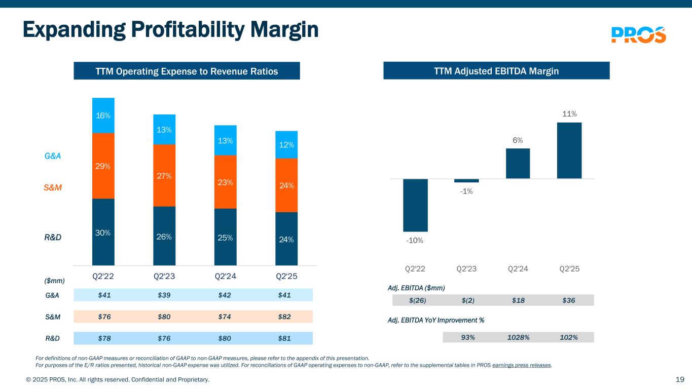 © 2025 PROS, Inc. All rights reserved. Confidential and Proprietary. Adjusted EBITDA Q3'23 Q4'23 Q1'24 Q2'24 Q3'24 Q4'24 Q1'25 Q2'25 GAAP Income (Loss) From Operations $ (7,842) $ (10,609) $ (10,302) $ (7,184) $ 31 $ (1,567) $ (3,825) $ (7,599) Amortization of acquisition-related intangibles 1,446 1,301 1,301 1,300 1,074 953 953 956 Severance - - - - - - - 1,147 Share-based compensation 10,933 10,768 12,700 10,248 7,271 10,535 10,669 12,010 Depreciation and other amortization 1,103 1,105 903 891 902 979 905 915 Capitalized internal-use software development costs - (48) (17) (41) - - - - Adjusted EBITDA $ 5,640 $ 2,517 $ 4,585 $ 5,214 $ 9,278 $ 10,900 $ 8,702 $ 7,429 Free Cash Flow Q3'23 Q4'23 Q1'24 Q2'24 Q3'24 Q4'24 Q1'25 Q2'25 Cash Flow From Operations $ 8,718 $ 13,844 $ (4,644) $ 6,420 $ 1,594 $ 24,013 $ 1,215 $ 3,215 Severance 121 211 - - - - - - Purchase of property and equipment (345) (375) (223) (215) (231) (497) (103) (41) Capitalized internal-use software development costs - (48) (17) (41) - - - - Free Cash Flow $ 8,494 $ 13,632 $ (4,884) $ 6,164 $ 1,363 $ 23,516 $ 1,112 $ 3,174 Supplemental Information - GAAP to Non-GAAP Reconciliations (In thousands, Unaudited) 35