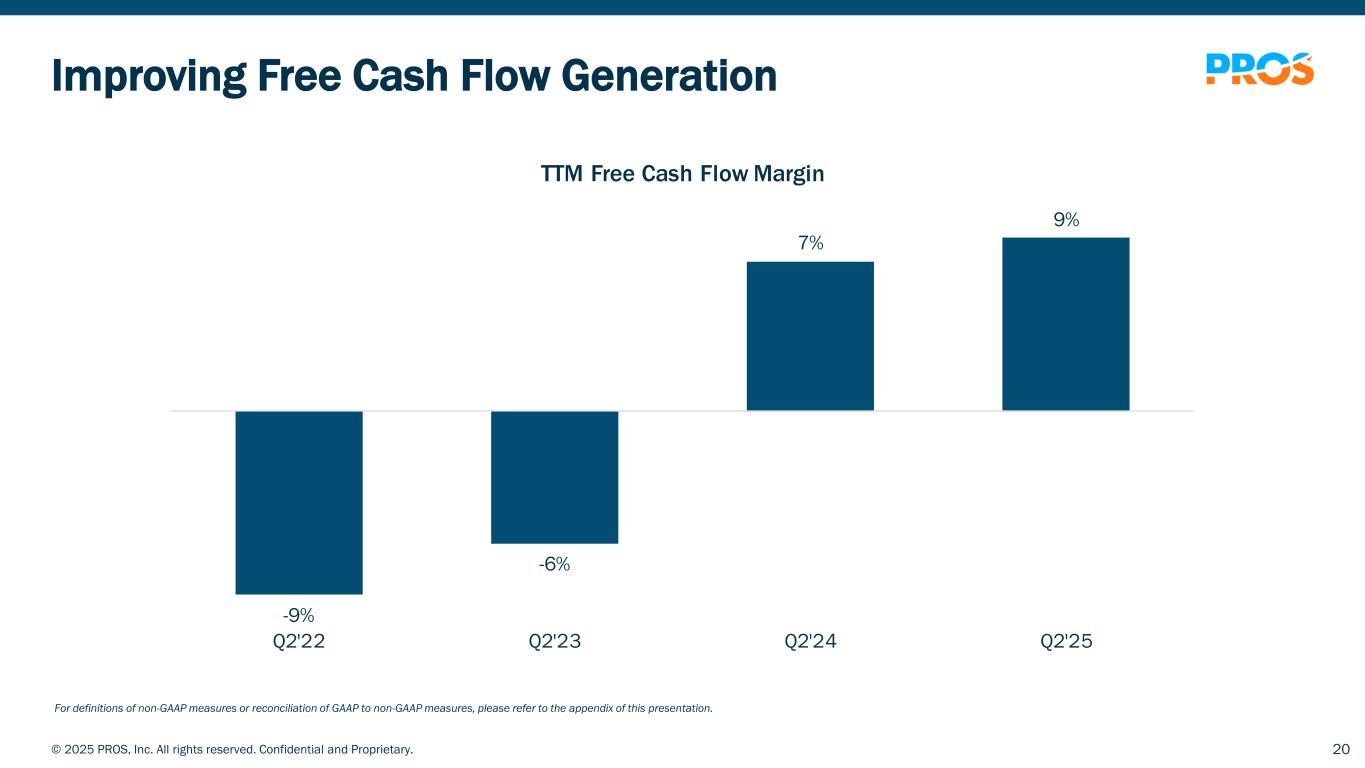 © 2025 PROS, Inc. All rights reserved. Confidential and Proprietary. -10% -1% 6% 11% Q2'22 Q2'23 Q2'24 Q2'25 30% 26% 25% 24% 29% 27% 23% 24% 16% 13% 13% 12% Q2'22 Q2'23 Q2'24 Q2'25 $(26) $(2) $18 $36 93% 1028% 102% Expanding Profitability Margin 19 TTM Operating Expense to Revenue Ratios TTM Adjusted EBITDA Margin G&A S&M R&D ($mm) Adj. EBITDA ($mm) Adj. EBITDA YoY Improvement % G&A S&M R&D For definitions of non-GAAP measures or reconciliation of GAAP to non-GAAP measures, please refer to the appendix of this presentation. For purposes of the E/R ratios presented, historical non-GAAP expense was utilized. For reconciliations of GAAP operating expenses to non-GAAP, refer to the supplemental tables in PROS earnings press releases. $41 $39 $42 $41 $76 $80 $74 $82 $78 $76 $80 $81