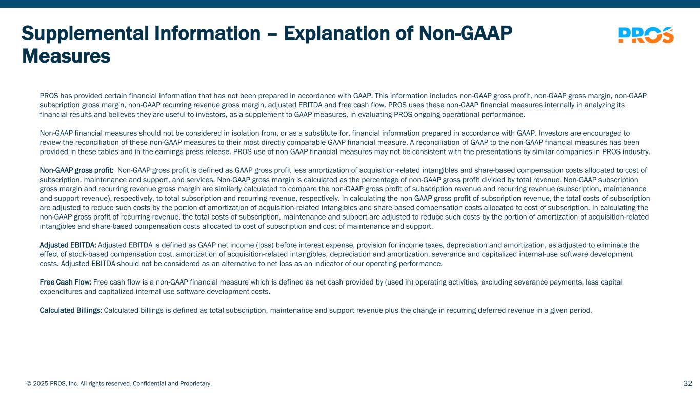 © 2025 PROS, Inc. All rights reserved. Confidential and Proprietary. Supplemental Information – Explanation of Non-GAAP Measures 32 PROS has provided certain financial information that has not been prepared in accordance with GAAP. This information includes non-GAAP gross profit, non-GAAP gross margin, non-GAAP subscription gross margin, non-GAAP recurring revenue gross margin, adjusted EBITDA and free cash flow. PROS uses these non-GAAP financial measures internally in analyzing its financial results and believes they are useful to investors, as a supplement to GAAP measures, in evaluating PROS ongoing operational performance. Non-GAAP financial measures should not be considered in isolation from, or as a substitute for, financial information prepared in accordance with GAAP. Investors are encouraged to review the reconciliation of these non-GAAP measures to their most directly comparable GAAP financial measure. A reconciliation of GAAP to the non-GAAP financial measures has been provided in these tables and in the earnings press release. PROS use of non-GAAP financial measures may not be consistent with the presentations by similar companies in PROS industry. Non-GAAP gross profit: Non-GAAP gross profit is defined as GAAP gross profit less amortization of acquisition-related intangibles and share-based compensation costs allocated to cost of subscription, maintenance and support, and services. Non-GAAP gross margin is calculated as the percentage of non-GAAP gross profit divided by total revenue. Non-GAAP subscription gross margin and recurring revenue gross margin are similarly calculated to compare the non-GAAP gross profit of subscription revenue and recurring revenue (subscription, maintenance and support revenue), respectively, to total subscription and recurring revenue, respectively. In calculating the non-GAAP gross profit of subscription revenue, the total costs of subscription are adjusted to reduce such costs by the portion of amortization of acquisition-related intangibles and share-based compensation costs allocated to cost of subscription. In calculating the non-GAAP gross profit of recurring revenue, the total costs of subscription, maintenance and support are adjusted to reduce such costs by the portion of amortization of acquisition-related intangibles and share-based compensation costs allocated to cost of subscription and cost of maintenance and support. Adjusted EBITDA: Adjusted EBITDA is defined as GAAP net income (loss) before interest expense, provision for income taxes, depreciation and amortization, as adjusted to eliminate the effect of stock-based compensation cost, amortization of acquisition-related intangibles, depreciation and amortization, severance and capitalized internal-use software development costs. Adjusted EBITDA should not be considered as an alternative to net loss as an indicator of our operating performance. Free Cash Flow: Free cash flow is a non-GAAP financial measure which is defined as net cash provided by (used in) operating activities, excluding severance payments, less capital expenditures and capitalized internal-use software development costs. Calculated Billings: Calculated billings is defined as total subscription, maintenance and support revenue plus the change in recurring deferred revenue in a given period.