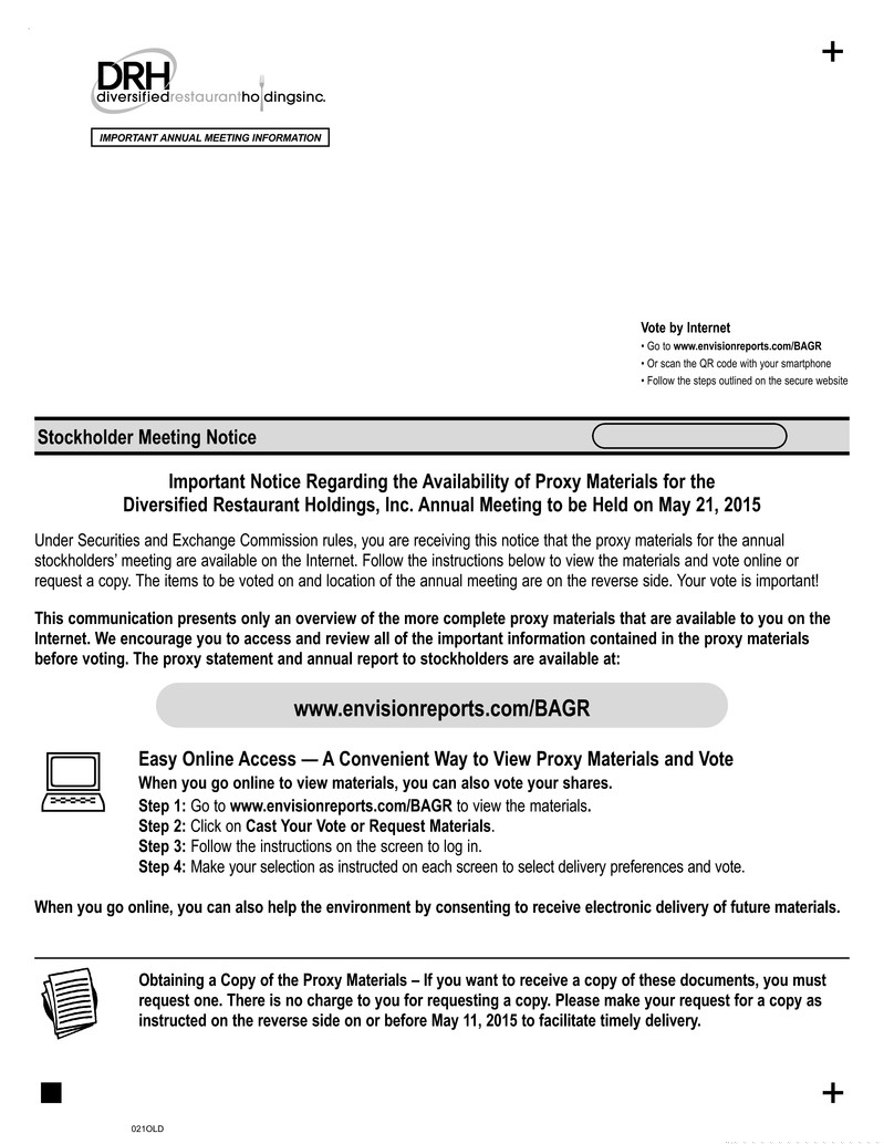 A copy of the Company’s Annual Report on form 10-K for the fiscal year ended December 28, 2014 can be found on the internet at www.edocumentview.com/bagr or, if a stockholder requested a paper copy, it is being delivered with this proxy statement, and is also available, along with the financial statements and the financial statement schedules required to be filed with the SEC pursuant to rule 13a-1 for the Company’s most recent fiscal year, without charge upon written request to: Investor Relations, Diversified Restaurant Holdings, Inc., 27680 Franklin Road, Southfield, Michigan 48034.