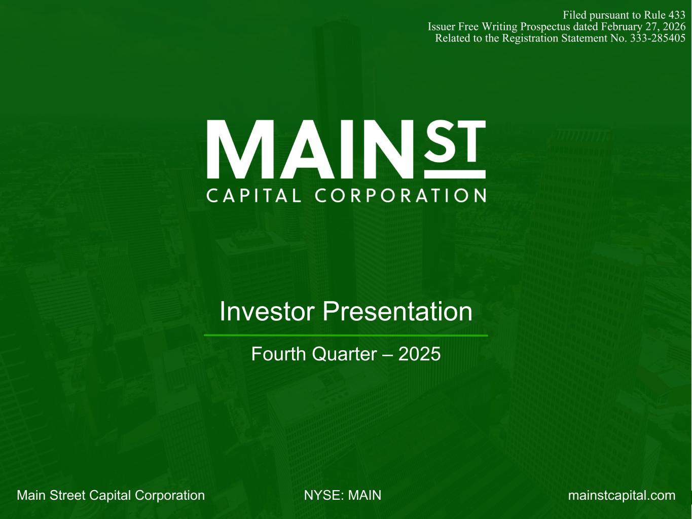 mainstcapital.comNYSE: MAINMain Street Capital Corporation www.mainstcapital.com Page 1 Investor Presentation Fourth Quarter – 2025 Main St et Capital Corporation NYSE: IN mainstc ital.com Filed pursuant to Rule 433 Issuer Free Writing Prospectus dated February 27, 2026 Related to the Registration Statement No. 333-285405