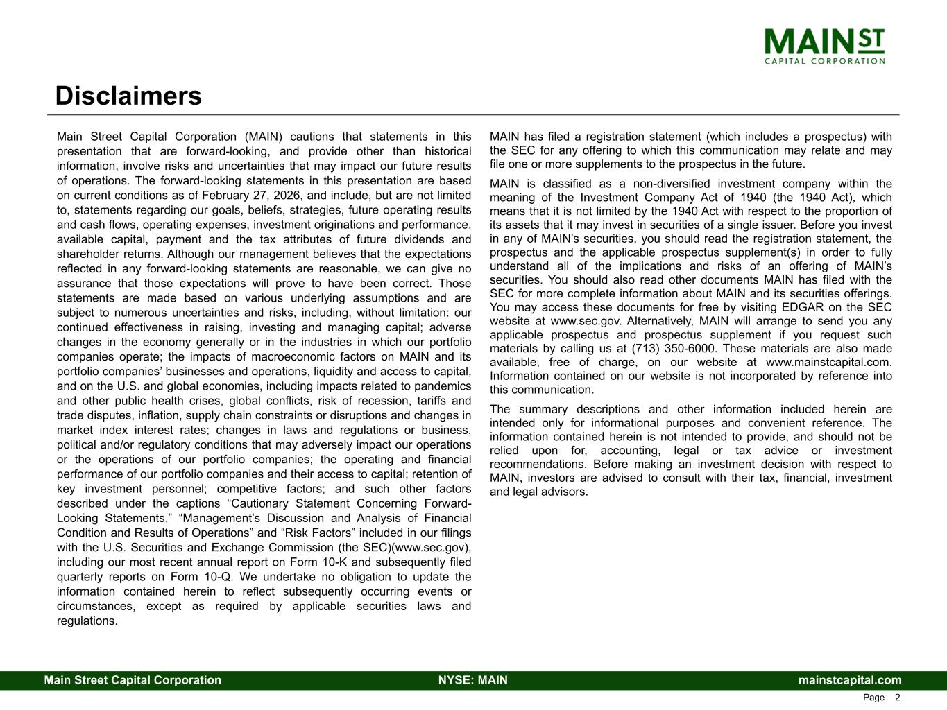 mainstcapital.comNYSE: MAINMain Street Capital Corporation www.mainstcapital.com Page 2 Disclaimers Main Street Capital Corporation (MAIN) cautions that statements in this presentation that are forward-looking, and provide other than historical information, involve risks and uncertainties that may impact our future results of operations. The forward-looking statements in this presentation are based on current conditions as of February 27, 2026, and include, but are not limited to, statements regarding our goals, beliefs, strategies, future operating results and cash flows, operating expenses, investment originations and performance, available capital, payment and the tax attributes of future dividends and shareholder returns. Although our management believes that the expectations reflected in any forward-looking statements are reasonable, we can give no assurance that those expectations will prove to have been correct. Those statements are made based on various underlying assumptions and are subject to numerous uncertainties and risks, including, without limitation: our continued effectiveness in raising, investing and managing capital; adverse changes in the economy generally or in the industries in which our portfolio companies operate; the impacts of macroeconomic factors on MAIN and its portfolio companies’ businesses and operations, liquidity and access to capital, and on the U.S. and global economies, including impacts related to pandemics and other public health crises, global conflicts, risk of recession, tariffs and trade disputes, inflation, supply chain constraints or disruptions and changes in market index interest rates; changes in laws and regulations or business, political and/or regulatory conditions that may adversely impact our operations or the operations of our portfolio companies; the operating and financial performance of our portfolio companies and their access to capital; retention of key investment personnel; competitive factors; and such other factors described under the captions “Cautionary Statement Concerning Forward- Looking Statements,” “Management’s Discussion and Analysis of Financial Condition and Results of Operations” and “Risk Factors” included in our filings with the U.S. Securities and Exchange Commission (the SEC)(www.sec.gov), including our most recent annual report on Form 10-K and subsequently filed quarterly reports on Form 10-Q. We undertake no obligation to update the information contained herein to reflect subsequently occurring events or circumstances, except as required by applicable securities laws and regulations. MAIN has filed a registration statement (which includes a prospectus) with the SEC for any offering to which this communication may relate and may file one or more supplements to the prospectus in the future. MAIN is classified as a non-diversified investment company within the meaning of the Investment Company Act of 1940 (the 1940 Act), which means that it is not limited by the 1940 Act with respect to the proportion of its assets that it may invest in securities of a single issuer. Before you invest in any of MAIN’s securities, you should read the registration statement, the prospectus and the applicable prospectus supplement(s) in order to fully understand all of the implications and risks of an offering of MAIN’s securities. You should also read other documents MAIN has filed with the SEC for more complete information about MAIN and its securities offerings. You may access these documents for free by visiting EDGAR on the SEC website at www.sec.gov. Alternatively, MAIN will arrange to send you any applicable prospectus and prospectus supplement if you request such materials by calling us at (713) 350-6000. These materials are also made available, free of charge, on our website at www.mainstcapital.com. Information contained on our website is not incorporated by reference into this communication. The summary descriptions and other information included herein are intended only for informational purposes and convenient reference. The information contained herein is not intended to provide, and should not be relied upon for, accounting, legal or tax advice or investment recommendations. Before making an investment decision with respect to MAIN, investors are advised to consult with their tax, financial, investment and legal advisors.
