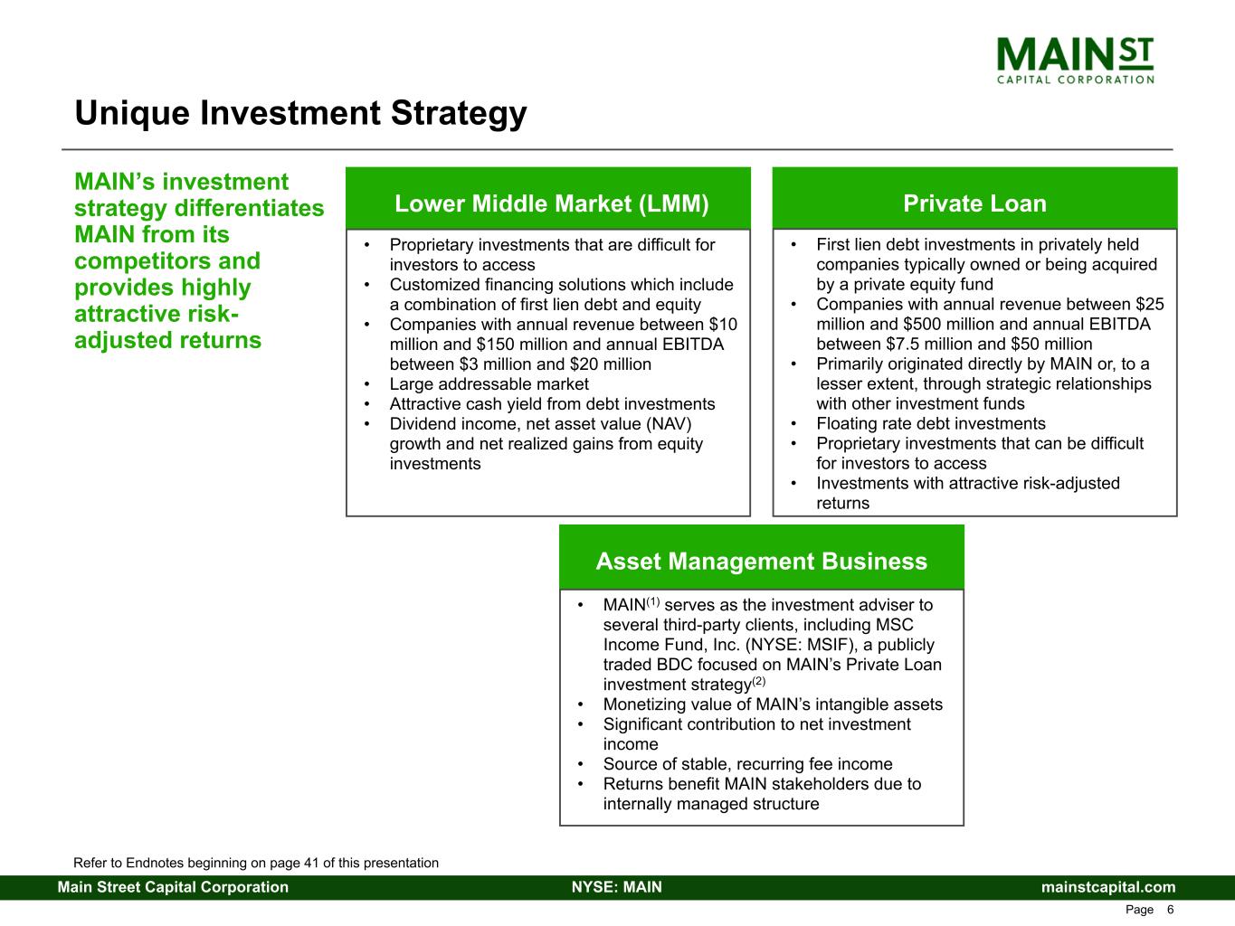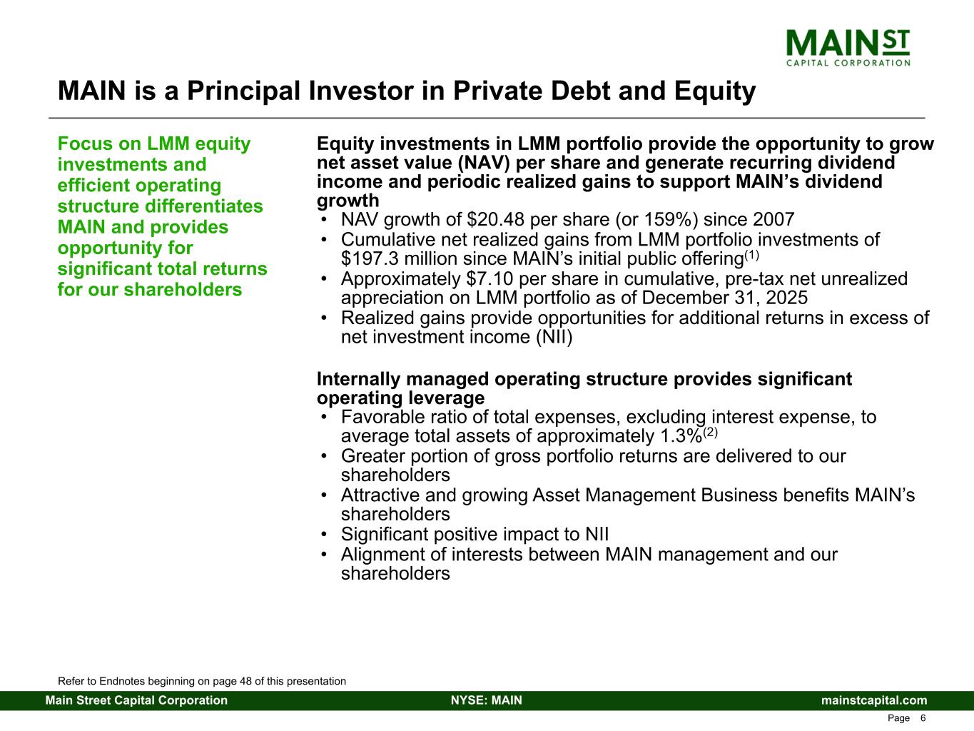mainstcapital.comNYSE: MAINMain Street Capital Corporation www.mainstcapital.com Page 5 Long-term focus on delivering our shareholders sustainable growth in net asset value and recurring dividends per share Consistent cash dividend yield – significant monthly dividends • MAIN has never decreased its monthly dividend rate • 136% increase in monthly dividends from $0.33 per share paid in Q4 2007(1) to declared dividends of $0.78 per share for Q2 2026 • Supplemental dividends, paid or declared, in addition to monthly dividends, of $1.20 per share during the last twelve months(2) Owns two Small Business Investment Company (SBIC) Funds • Main Street Mezzanine Fund (2002 vintage) and Main Street Capital III (2016 vintage) • Provides access to 10-year, low cost, fixed rate U.S. government- backed leverage Strong capitalization and liquidity position – stable, long-term debt and significant available liquidity to take advantage of opportunities • Favorable opportunities in capital markets through issuer investment grade ratings of BBB-/Stable from both Fitch Ratings and Standard & Poor’s Global Ratings(3) • Total SBIC debentures regulatory financing capacity of $350.0 million, the maximum amount permitted under current U.S. Small Business Administration (SBA) regulations MAIN’s unique investment strategy, efficient operating structure and conservative capitalization are designed to provide sustainable, long-term growth in recurring monthly dividends, meaningful supplemental dividends and long-term capital appreciation to our shareholders MAIN is a Principal Investor in Private Debt and Equity Refer to Endnotes beginning on page 48 of this presentation