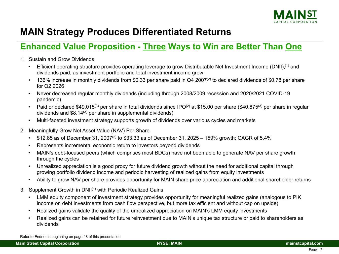 mainstcapital.comNYSE: MAINMain Street Capital Corporation www.mainstcapital.com Page 6 Equity investments in LMM portfolio provide the opportunity to grow net asset value (NAV) per share and generate recurring dividend income and periodic realized gains to support MAIN’s dividend growth • NAV growth of $20.48 per share (or 159%) since 2007 • Cumulative net realized gains from LMM portfolio investments of $197.3 million since MAIN’s initial public offering(1) • Approximately $7.10 per share in cumulative, pre-tax net unrealized appreciation on LMM portfolio as of December 31, 2025 • Realized gains provide opportunities for additional returns in excess of net investment income (NII) Internally managed operating structure provides significant operating leverage • Favorable ratio of total expenses, excluding interest expense, to average total assets of approximately 1.3%(2) • Greater portion of gross portfolio returns are delivered to our shareholders • Attractive and growing Asset Management Business benefits MAIN’s shareholders • Significant positive impact to NII • Alignment of interests between MAIN management and our shareholders Focus on LMM equity investments and efficient operating structure differentiates MAIN and provides opportunity for significant total returns for our shareholders MAIN is a Principal Investor in Private Debt and Equity Refer to Endnotes beginning on page 48 of this presentation