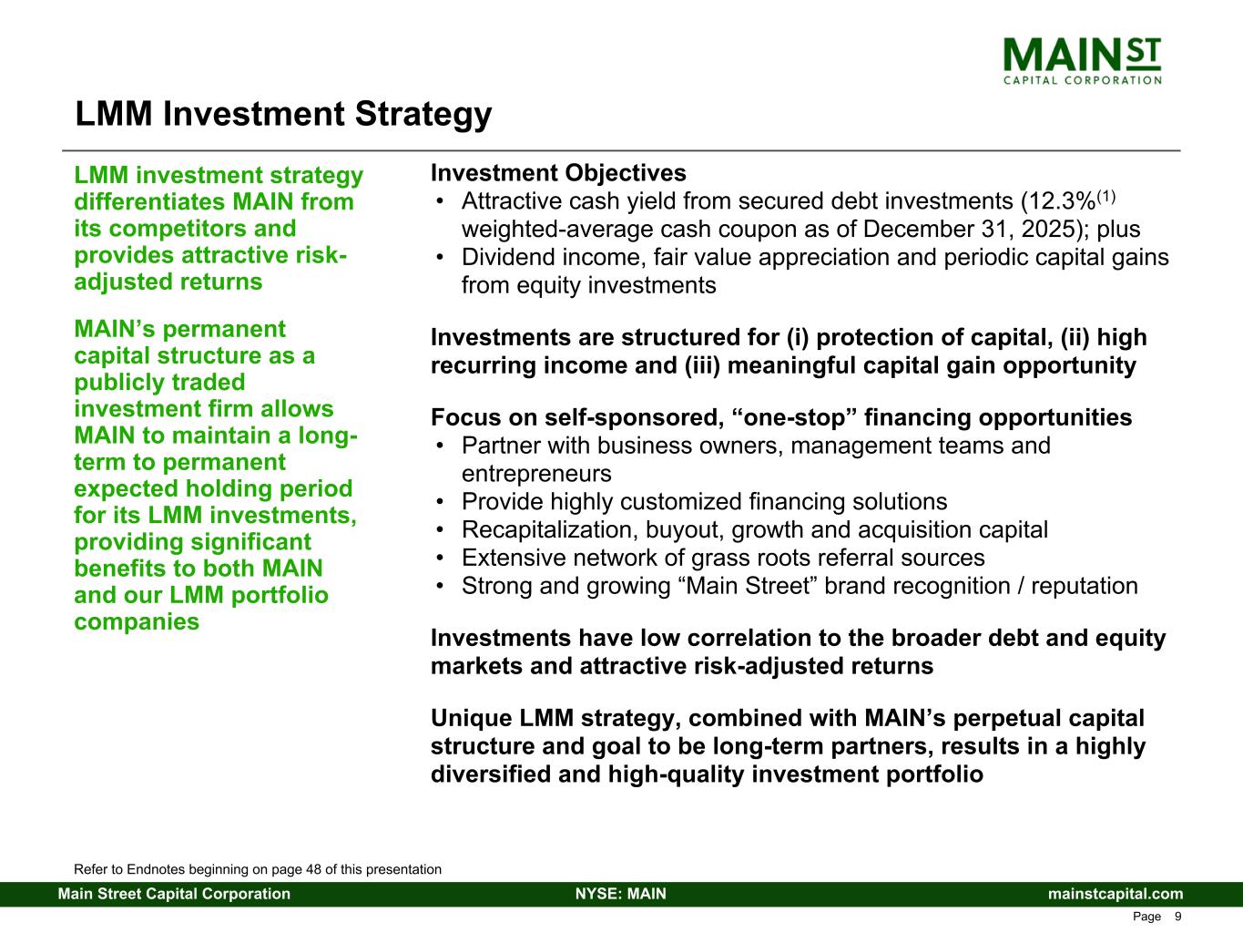 mainstcapital.comNYSE: MAINMain Street Capital Corporation www.mainstcapital.com Page 9 LMM Investment Strategy Investment Objectives • Attractive cash yield from secured debt investments (12.3%(1) weighted-average cash coupon as of December 31, 2025); plus • Dividend income, fair value appreciation and periodic capital gains from equity investments Investments are structured for (i) protection of capital, (ii) high recurring income and (iii) meaningful capital gain opportunity Focus on self-sponsored, “one-stop” financing opportunities • Partner with business owners, management teams and entrepreneurs • Provide highly customized financing solutions • Recapitalization, buyout, growth and acquisition capital • Extensive network of grass roots referral sources • Strong and growing “Main Street” brand recognition / reputation Investments have low correlation to the broader debt and equity markets and attractive risk-adjusted returns Unique LMM strategy, combined with MAIN’s perpetual capital structure and goal to be long-term partners, results in a highly diversified and high-quality investment portfolio LMM investment strategy differentiates MAIN from its competitors and provides attractive risk- adjusted returns MAIN’s permanent capital structure as a publicly traded investment firm allows MAIN to maintain a long- term to permanent expected holding period for its LMM investments, providing significant benefits to both MAIN and our LMM portfolio companies Refer to Endnotes beginning on page 48 of this presentation