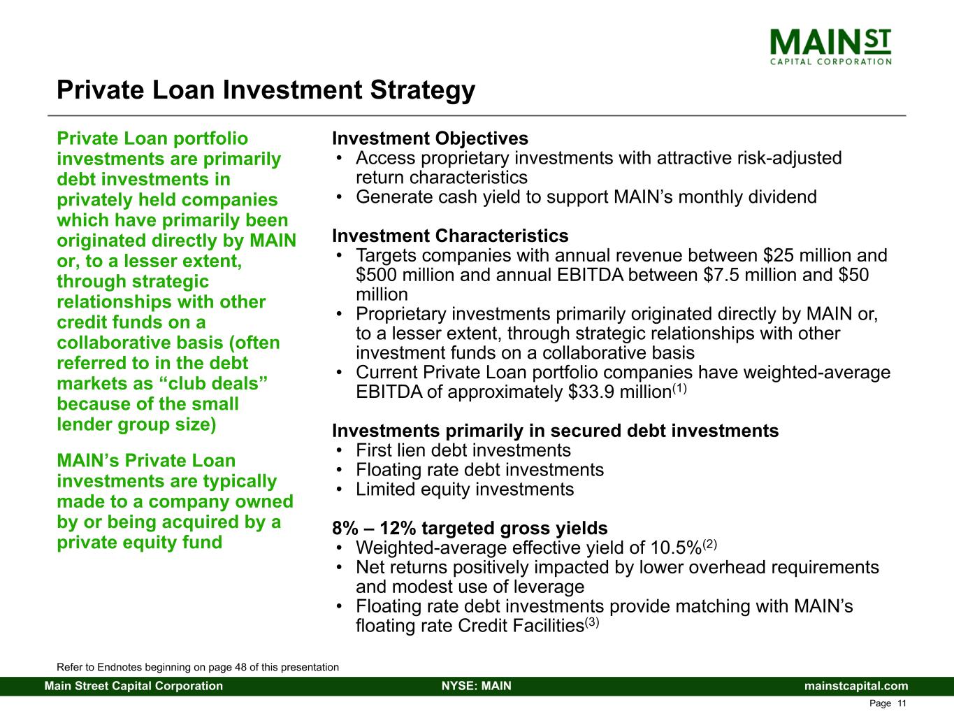 mainstcapital.comNYSE: MAINMain Street Capital Corporation www.mainstcapital.com Page 11 Private Loan Investment Strategy Investment Objectives • Access proprietary investments with attractive risk-adjusted return characteristics • Generate cash yield to support MAIN’s monthly dividend Investment Characteristics • Targets companies with annual revenue between $25 million and $500 million and annual EBITDA between $7.5 million and $50 million • Proprietary investments primarily originated directly by MAIN or, to a lesser extent, through strategic relationships with other investment funds on a collaborative basis • Current Private Loan portfolio companies have weighted-average EBITDA of approximately $33.9 million(1) Investments primarily in secured debt investments • First lien debt investments • Floating rate debt investments • Limited equity investments 8% – 12% targeted gross yields • Weighted-average effective yield of 10.5%(2) • Net returns positively impacted by lower overhead requirements and modest use of leverage • Floating rate debt investments provide matching with MAIN’s floating rate Credit Facilities(3) Private Loan portfolio investments are primarily debt investments in privately held companies which have primarily been originated directly by MAIN or, to a lesser extent, through strategic relationships with other credit funds on a collaborative basis (often referred to in the debt markets as “club deals” because of the small lender group size) MAIN’s Private Loan investments are typically made to a company owned by or being acquired by a private equity fund Refer to Endnotes beginning on page 48 of this presentation