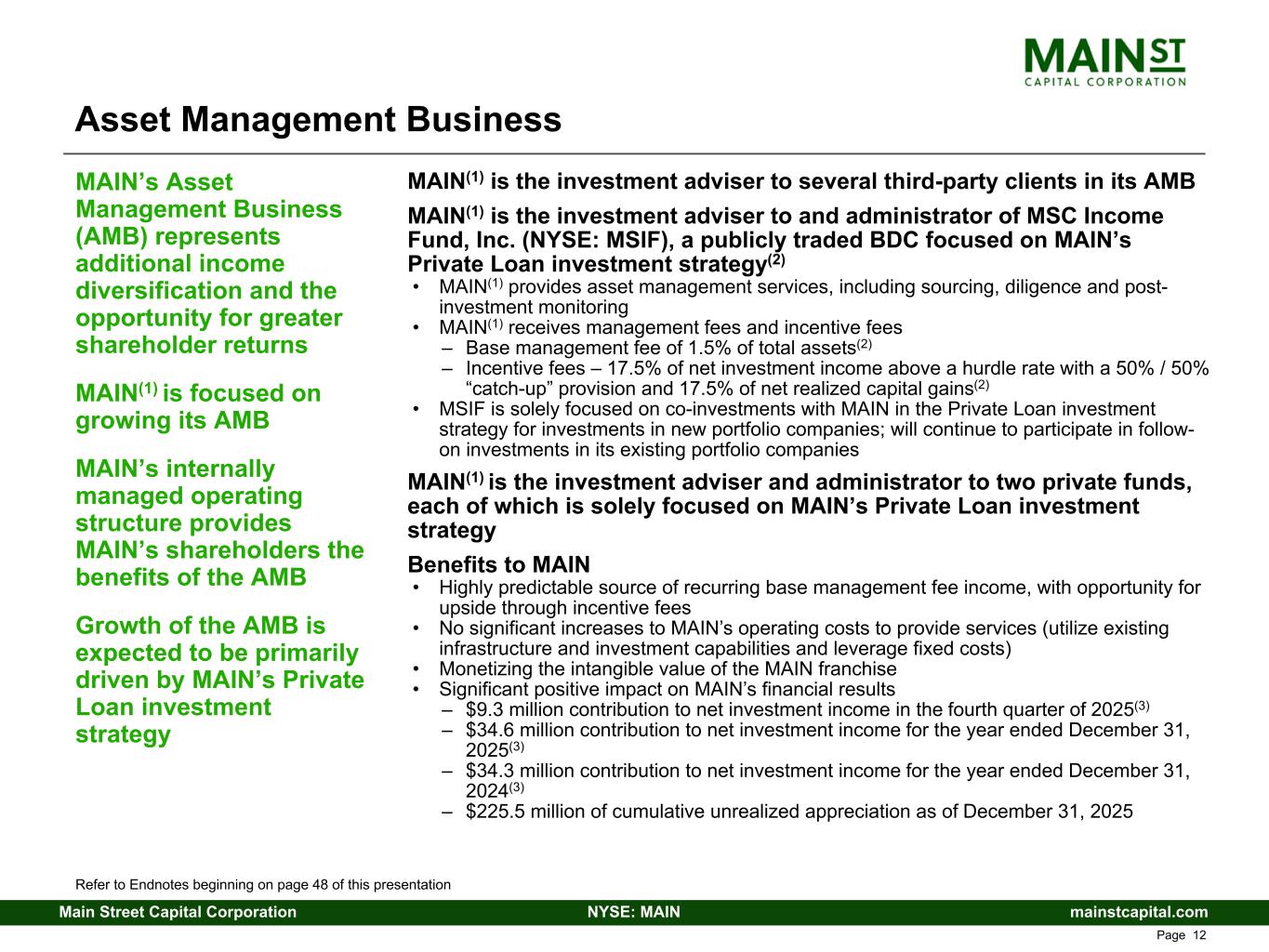 mainstcapital.comNYSE: MAINMain Street Capital Corporation www.mainstcapital.com Page 12 Asset Management Business MAIN(1) is the investment adviser to several third-party clients in its AMB MAIN(1) is the investment adviser to and administrator of MSC Income Fund, Inc. (NYSE: MSIF), a publicly traded BDC focused on MAIN’s Private Loan investment strategy(2) • MAIN(1) provides asset management services, including sourcing, diligence and post- investment monitoring • MAIN(1) receives management fees and incentive fees – Base management fee of 1.5% of total assets(2) – Incentive fees – 17.5% of net investment income above a hurdle rate with a 50% / 50% “catch-up” provision and 17.5% of net realized capital gains(2) • MSIF is solely focused on co-investments with MAIN in the Private Loan investment strategy for investments in new portfolio companies; will continue to participate in follow- on investments in its existing portfolio companies MAIN(1) is the investment adviser and administrator to two private funds, each of which is solely focused on MAIN’s Private Loan investment strategy Benefits to MAIN • Highly predictable source of recurring base management fee income, with opportunity for upside through incentive fees • No significant increases to MAIN’s operating costs to provide services (utilize existing infrastructure and investment capabilities and leverage fixed costs) • Monetizing the intangible value of the MAIN franchise • Significant positive impact on MAIN’s financial results – $9.3 million contribution to net investment income in the fourth quarter of 2025(3) – $34.6 million contribution to net investment income for the year ended December 31, 2025(3) – $34.3 million contribution to net investment income for the year ended December 31, 2024(3) – $225.5 million of cumulative unrealized appreciation as of December 31, 2025 MAIN’s Asset Management Business (AMB) represents additional income diversification and the opportunity for greater shareholder returns MAIN(1) is focused on growing its AMB MAIN’s internally managed operating structure provides MAIN’s shareholders the benefits of the AMB Growth of the AMB is expected to be primarily driven by MAIN’s Private Loan investment strategy Refer to Endnotes beginning on page 48 of this presentation