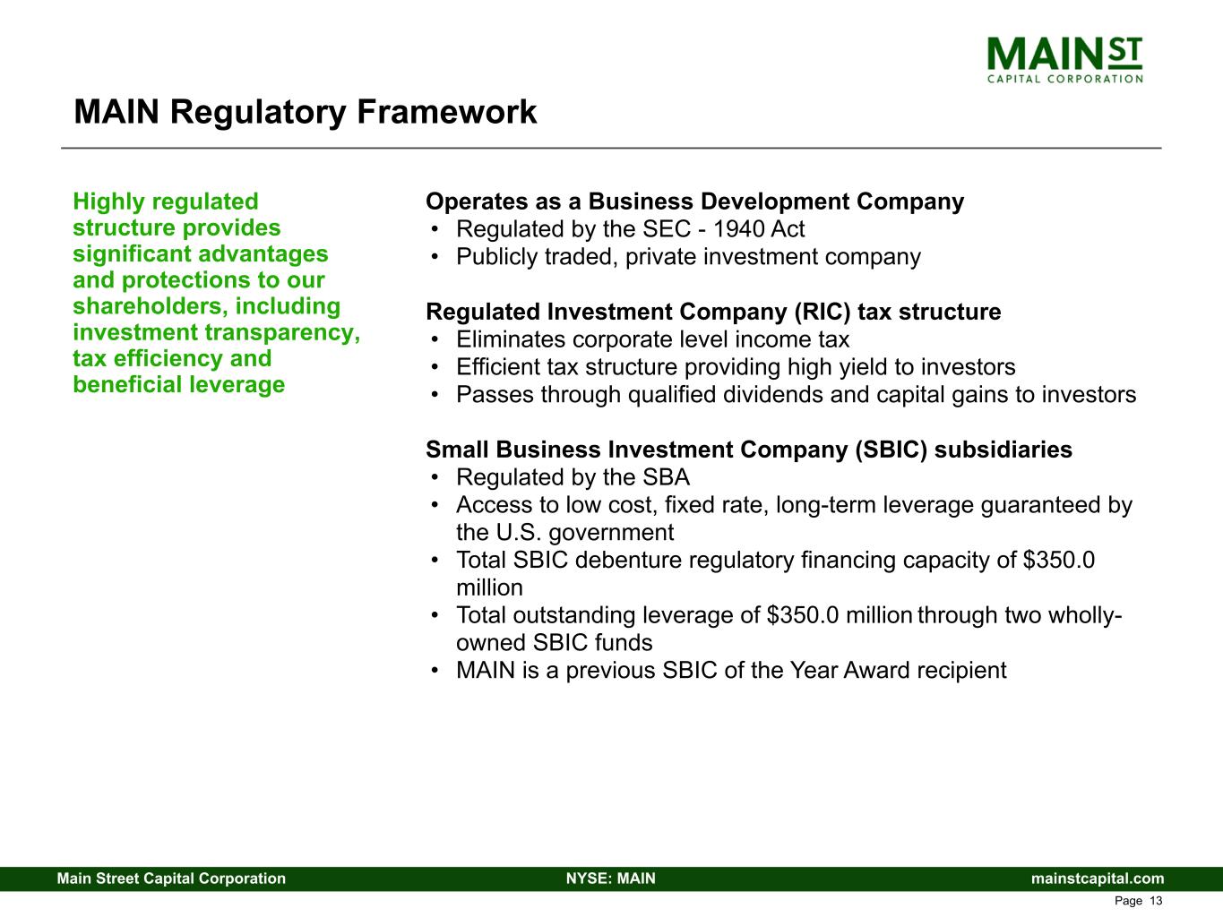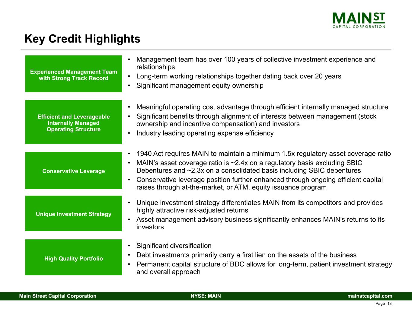 mainstcapital.comNYSE: MAINMain Street Capital Corporation www.mainstcapital.com Page 12 Conservative Leverage – Excess Collateral Improves Over Time MAIN’s conservative use of leverage and equity to fund its growth results in significant excess collateral that provides protection to lenders MAIN’s management of its capital structure results in a reduced risk profile for debt investors over time Excess collateral available to unsecured lenders has increased by 351% since MAIN’s first investment grade (IG) debt issuance ($ millions) 9/30/2014 (1) 12/31/2025 Total Assets Excluding SBIC Assets $ 1,137 $ 5,087 Add: Equity Value of SBIC Entities(2) 218 250 Total Collateral Available to Secured Lenders $ 1,355 $ 5,337 Less: Secured Debt (Credit Facilities)(3) (287) (518) Excess Collateral Available to Unsecured Lenders $ 1,068 $ 4,819 Increase since first IG debt issuance(4) 351 % Less: Unsecured Debt Outstanding (par value) (91) (1,600) Remaining Excess Collateral Available to Unsecured Lenders $ 977 $ 3,219 Increase since first IG debt issuance(4) 229 % (5) Refer to Endnotes beginning on page 41 of this presentation