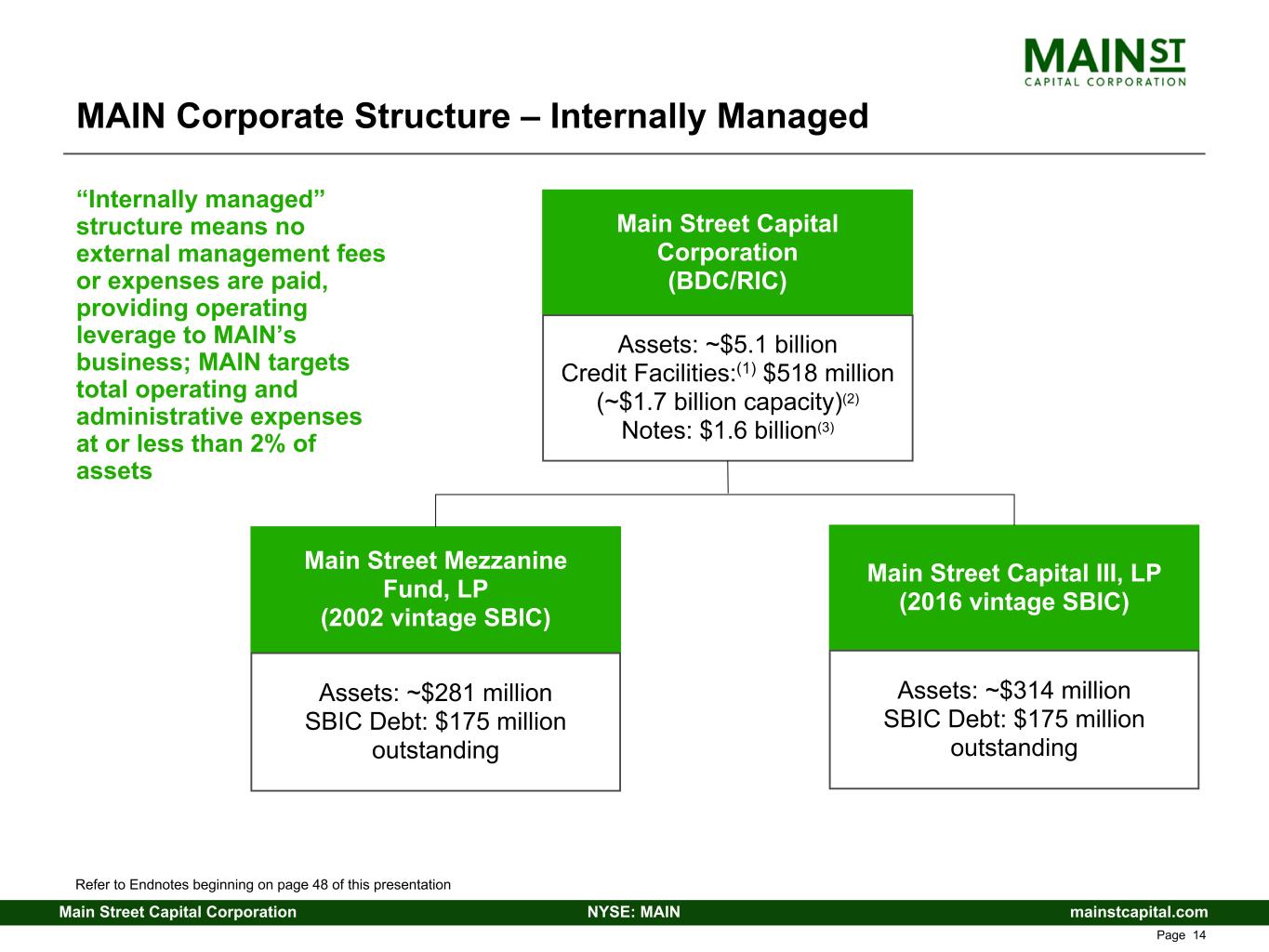 mainstcapital.comNYSE: MAINMain Street Capital Corporation www.mainstcapital.com Page 13 MAIN Regulatory Framework Operates as a Business Development Company • Regulated by the SEC - 1940 Act • Publicly traded, private investment company Regulated Investment Company (RIC) tax structure • Eliminates corporate level income tax • Efficient tax structure providing high yield to investors • Passes through qualified dividends and capital gains to investors Small Business Investment Company (SBIC) subsidiaries • Regulated by the SBA • Access to low cost, fixed rate, long-term leverage guaranteed by the U.S. government • Total SBIC debenture regulatory financing capacity of $350.0 million • Total outstanding leverage of $350.0 million through two wholly- owned SBIC funds • MAIN is a previous SBIC of the Year Award recipient Highly regulated structure provides significant advantages and protections to our shareholders, including investment transparency, tax efficiency and beneficial leverage