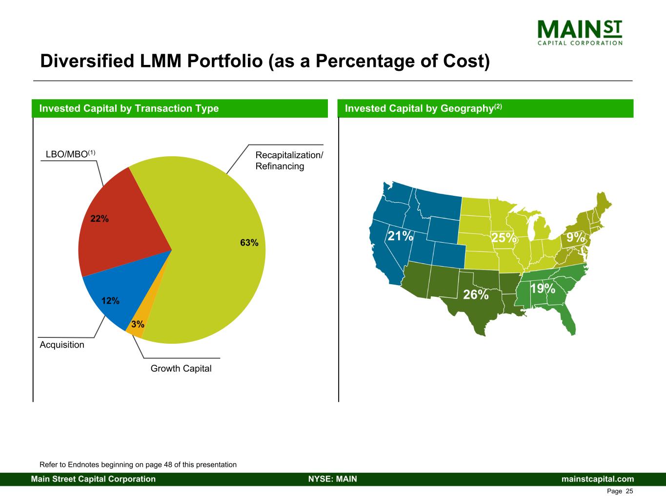 mainstcapital.comNYSE: MAINMain Street Capital Corporation www.mainstcapital.com Page 21 Diversified Total Portfolio (as a Percentage of Cost)(1) Invested Capital by Transaction Type Invested Capital by Geography(3) 26% 20% 20% 18% 16% LBO/MBO(2) Acquisition Growth Capital Recapitalization/ Refinancing 17% 32% 49% 2% Refer to Endnotes beginning on page 48 of this presentation