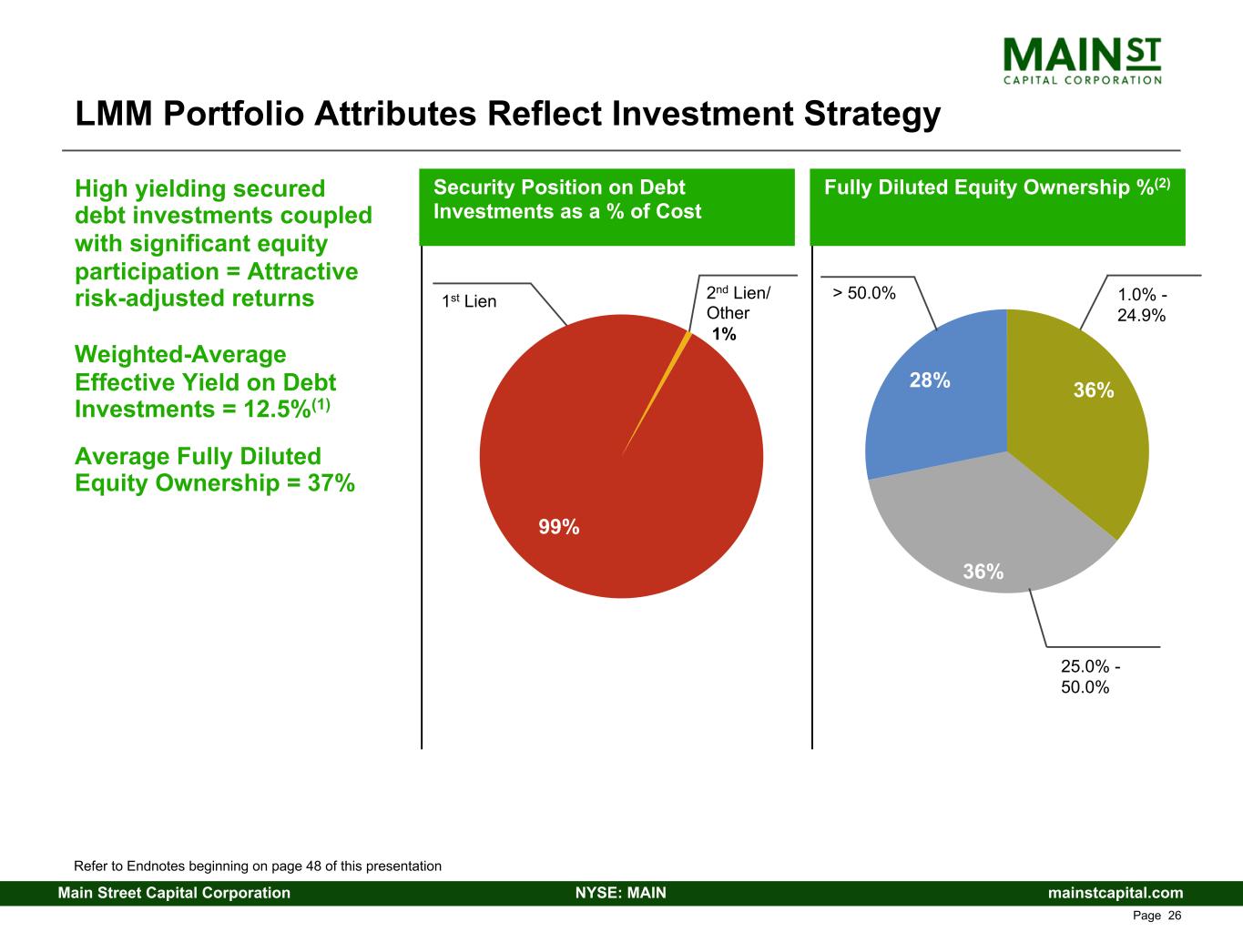 mainstcapital.comNYSE: MAINMain Street Capital Corporation www.mainstcapital.com Page 25 Diversified LMM Portfolio (as a Percentage of Cost) Invested Capital by Geography(2) 21% 25% 26% 19% 9% Invested Capital by Transaction Type LBO/MBO(1) Recapitalization/ Refinancing Growth Capital Acquisition Refer to Endnotes beginning on page 48 of this presentation 12% 22% 63% 3%