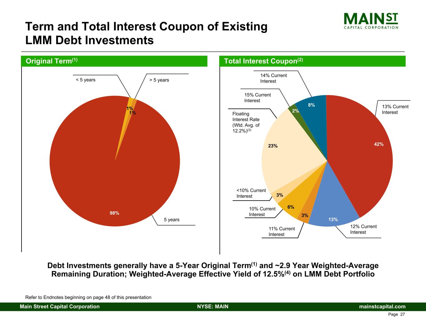 mainstcapital.comNYSE: MAINMain Street Capital Corporation www.mainstcapital.com Page 26 2nd Lien/ Other 1st Lien Security Position on Debt Investments as a % of Cost LMM Portfolio Attributes Reflect Investment Strategy High yielding secured debt investments coupled with significant equity participation = Attractive risk-adjusted returns Weighted-Average Effective Yield on Debt Investments = 12.5%(1) Average Fully Diluted Equity Ownership = 37% Fully Diluted Equity Ownership %(2) 36% 36% 28% 1% > 50.0% 1.0% - 24.9% 25.0% - 50.0% Refer to Endnotes beginning on page 48 of this presentation 99%
