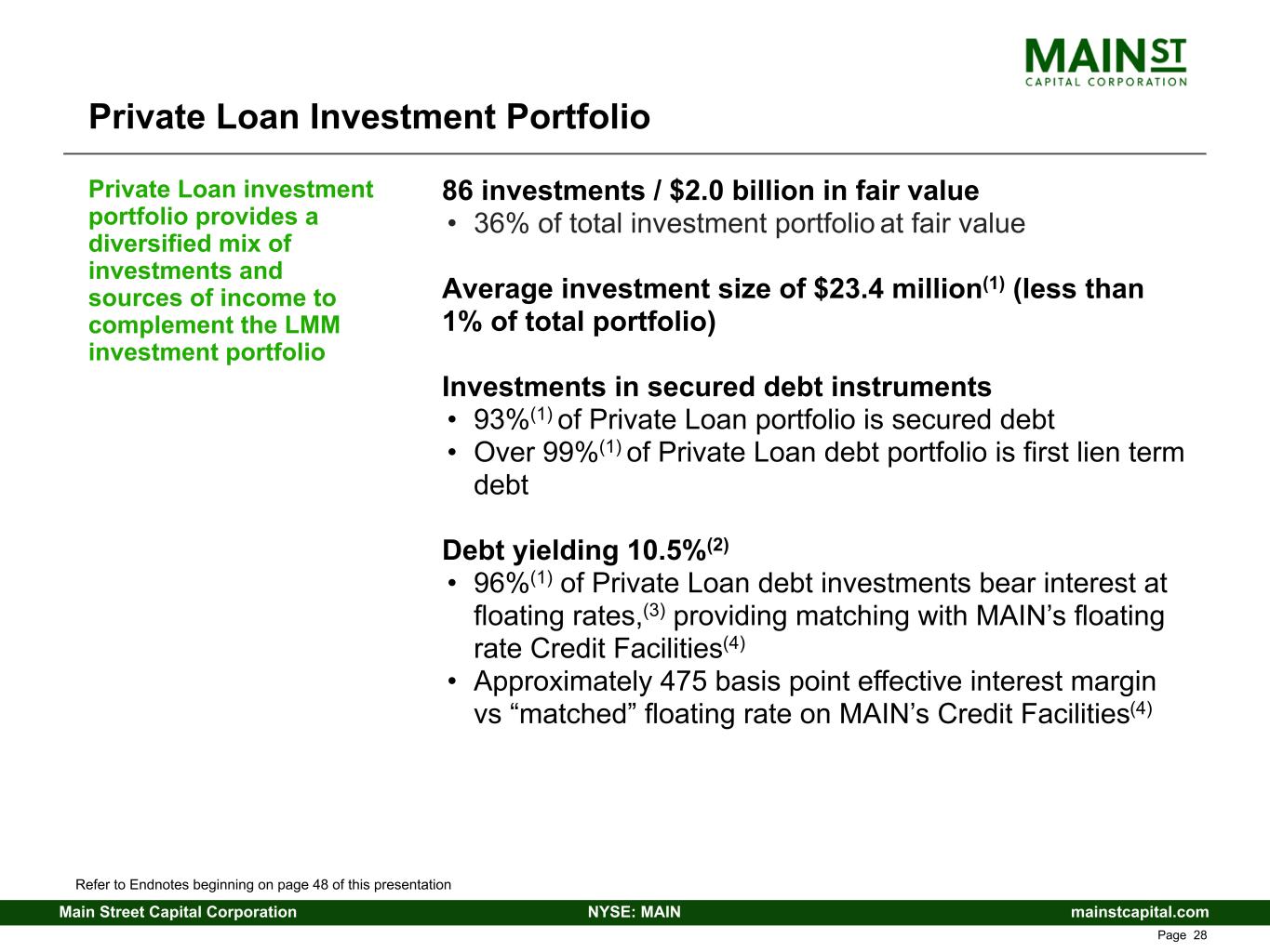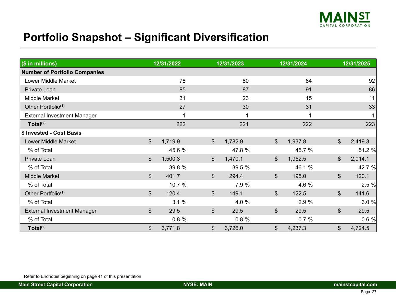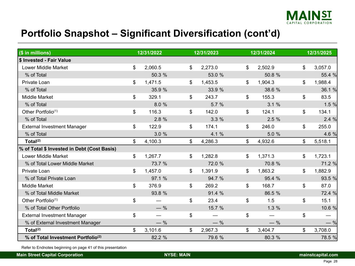 mainstcapital.comNYSE: MAINMain Street Capital Corporation www.mainstcapital.com Page 27 Portfolio Snapshot – Significant Diversification ($ in millions) 12/31/2022 12/31/2023 12/31/2024 12/31/2025 Number of Portfolio Companies Lower Middle Market 78 80 84 92 Private Loan 85 87 91 86 Middle Market 31 23 15 11 Other Portfolio(1) 27 30 31 33 External Investment Manager 1 1 1 1 Total(2) 222 221 222 223 $ Invested - Cost Basis Lower Middle Market $ 1,719.9 $ 1,782.9 $ 1,937.8 $ 2,419.3 % of Total 45.6 % 47.8 % 45.7 % 51.2 % Private Loan $ 1,500.3 $ 1,470.1 $ 1,952.5 $ 2,014.1 % of Total 39.8 % 39.5 % 46.1 % 42.7 % Middle Market $ 401.7 $ 294.4 $ 195.0 $ 120.1 % of Total 10.7 % 7.9 % 4.6 % 2.5 % Other Portfolio(1) $ 120.4 $ 149.1 $ 122.5 $ 141.6 % of Total 3.1 % 4.0 % 2.9 % 3.0 % External Investment Manager $ 29.5 $ 29.5 $ 29.5 $ 29.5 % of Total 0.8 % 0.8 % 0.7 % 0.6 % Total(2) $ 3,771.8 $ 3,726.0 $ 4,237.3 $ 4,724.5 Refer to Endnotes beginning on page 41 of this presentation